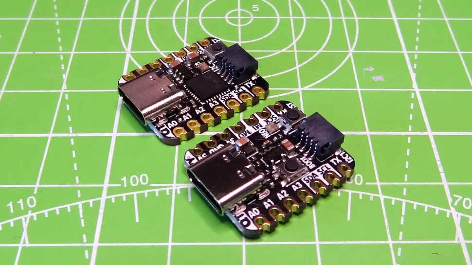 У нас уже есть предыдущая версия на базе чипа SAMD21. Если сравнивать их, то особой разницы не видно: у обеих одинаковое расположение контактов GPIO, одинаковый размер и разъем Stemma QT. Единственное физическое отличие — дополнительная кнопка и другой чип.