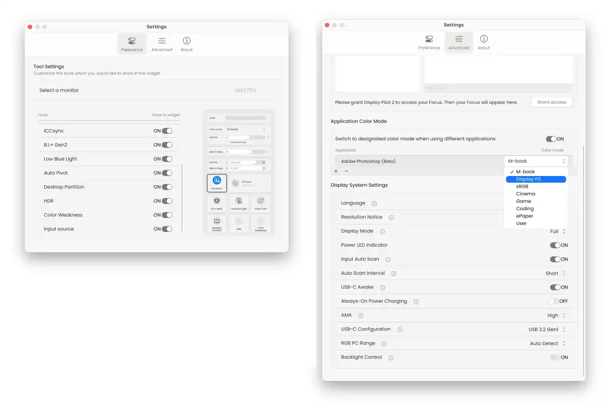 BenQ MA270U: встроенные элементы управления и программное обеспечение Display Pilot 2