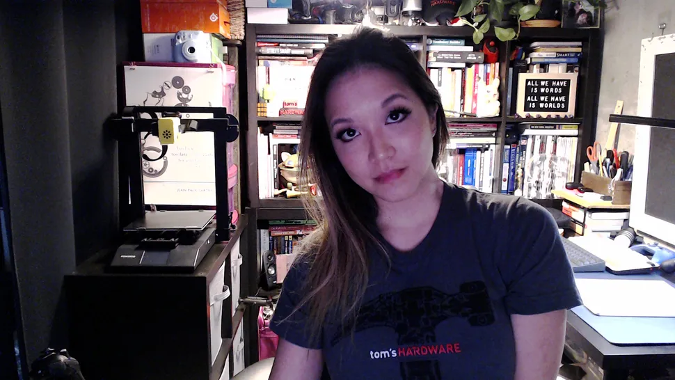 Чтобы проверить, как Brio 500 справляется с переэкспонированными изображениями, я выключил все источники света перед собой, а также три из четырёх мониторов, оставив включёнными фоновое освещение и один 27-дюймовый монитор. Brio 500 отлично справился с задачей, обеспечив мне хорошее освещение, хотя фон всё равно выглядит переэкспонированным. Результат не идеален — если присмотреться, можно заметить, что черты моего лица всё ещё недостаточно проработаны по сравнению с хорошо освещённым фоном, — но в целом изображение выглядит очень хорошо, и меня особенно впечатляет то, насколько равномерно освещена моя кожа и насколько она гладкая.