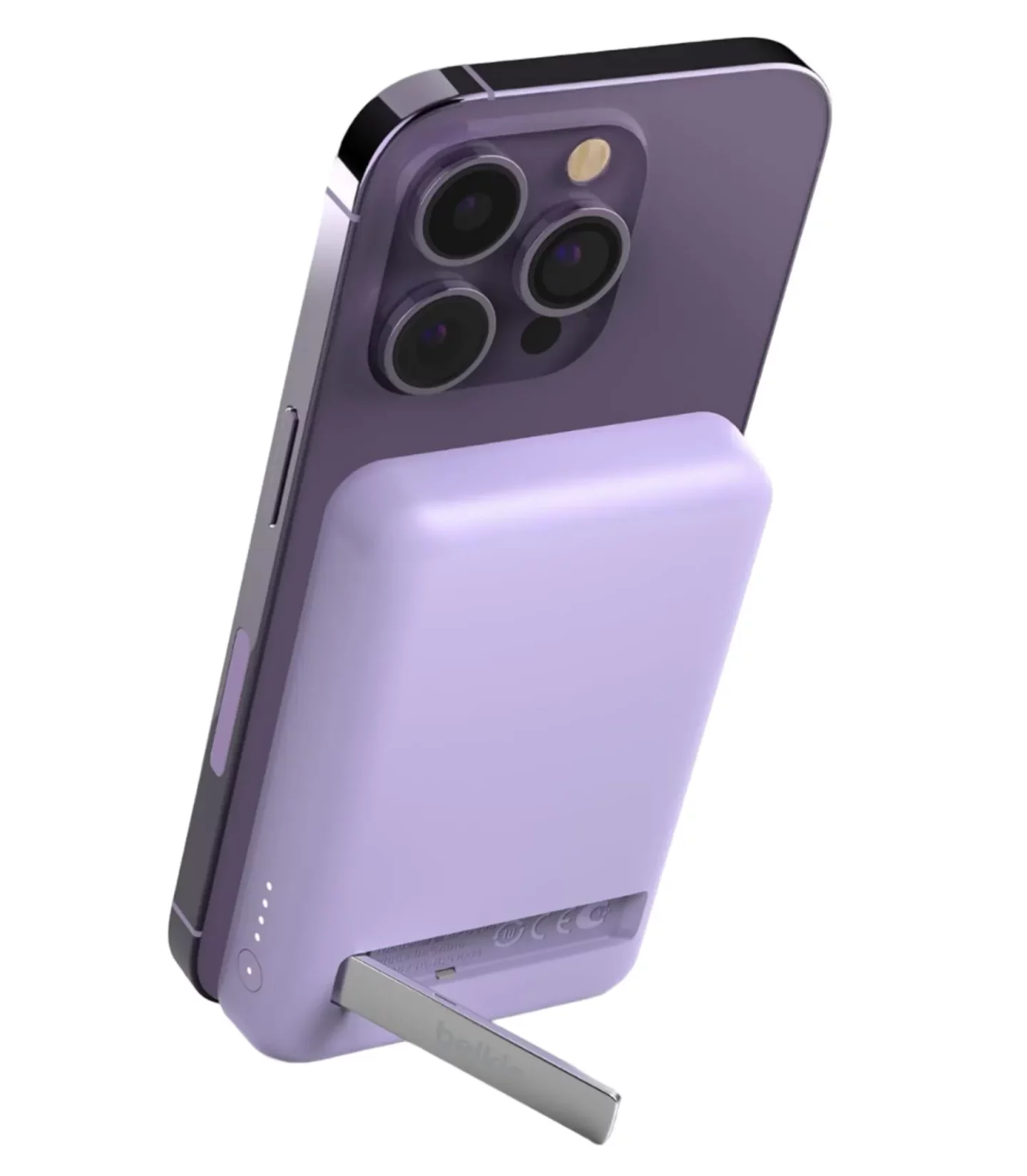 Вот фиолетовое портативное зарядное устройство, которое понравится тем, кто любит нежные цвета. Благодаря совместимости с MagSafe и выдвижной подставке оно идеально подходит для просмотра видео или FaceTime во время зарядки. Я никогда не путешествую без него. Благодаря подставке его особенно удобно использовать для просмотра фильмов в самолёте.