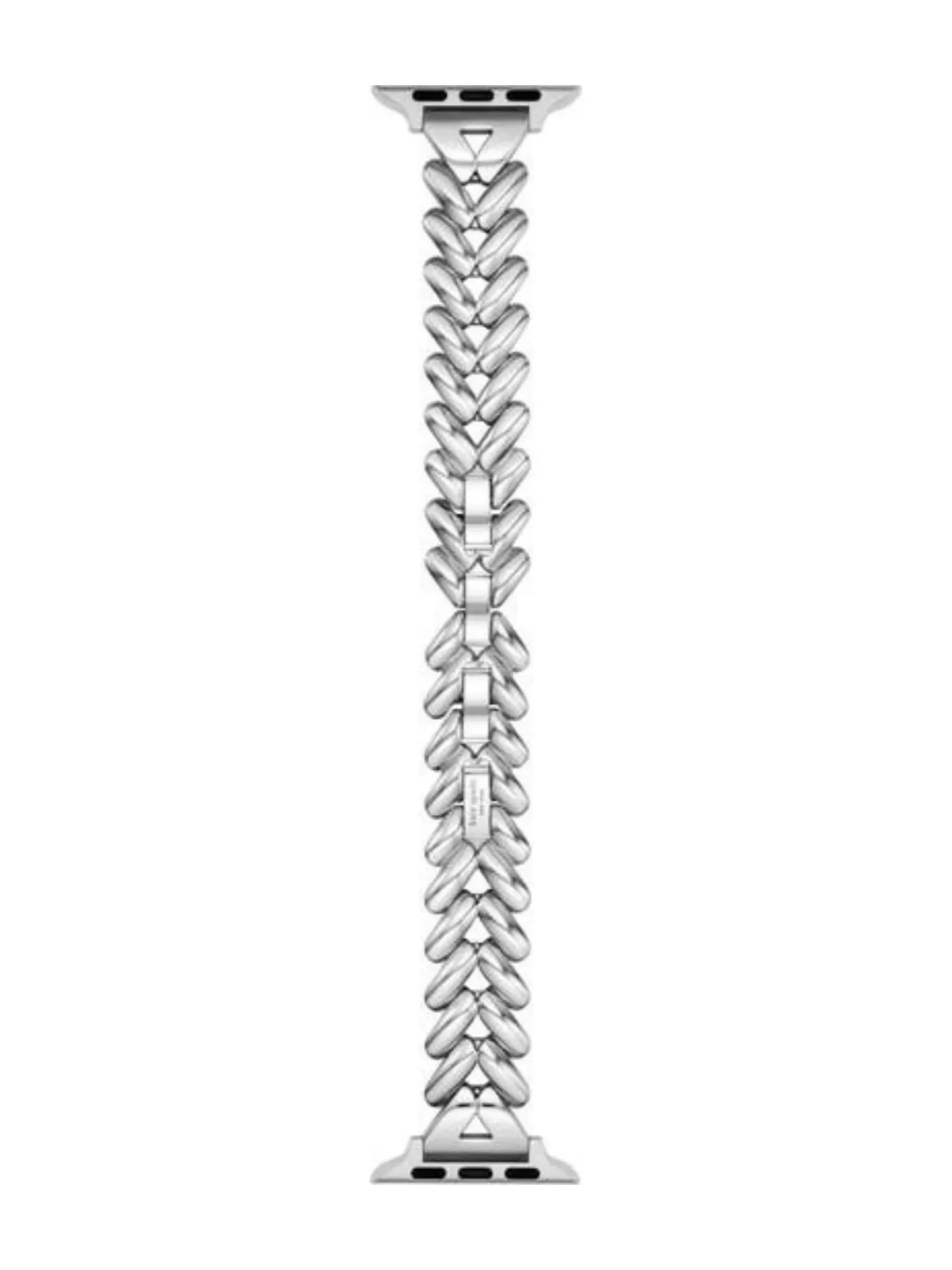 Этот ремешок для Apple Watch — настоящее стилистическое обновление. Гладкие звенья в виде елочки придают ему модный серебристый оттенок — идеально для женщины, которая любит быть в тренде.