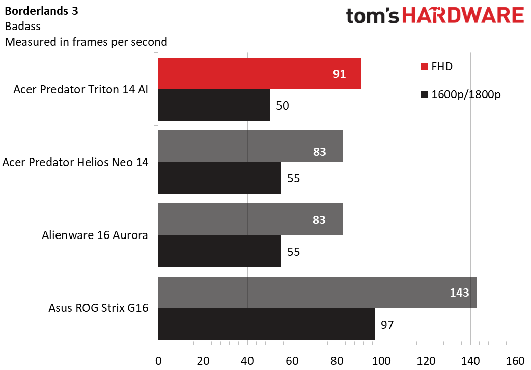 Наконец, в Borderlands 3 на пресете Badass ноутбук Triton выдал отличные 91 FPS при 1080p, обогнав Helios и Alienware (по 83 FPS у каждого). В родном разрешении его 50 FPS были солидным результатом, чуть позади их 55 FPS.
