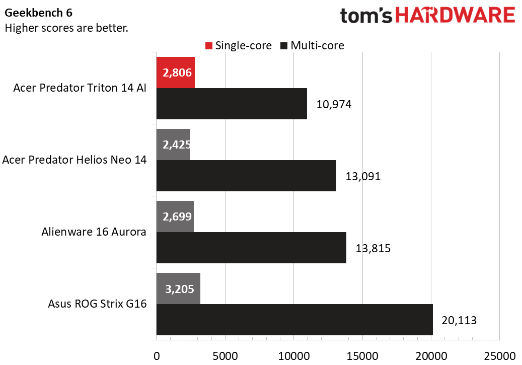 В процессорном тесте Geekbench 6 Triton хорошо показал себя в однопоточном режиме, набрав 2 806 баллов и обойдя Helios на Core Ultra 7 155H (2 425) и Alienware на Core 7 240H (2 699), хотя и не дотянул до 3 205 баллов у Asus с его мощным Ryzen 9 9955HX3D. Однако многопоточные результаты подчеркнули ограничения теплопакета в 30 Вт и меньшего количества ядер — их всего восемь против 16 у конкурентов. Triton показал самый низкий результат в 10 974 балла, тогда как Helios и Alienware превысили 13 000, а Asus перешагнул отметку в 20 000.