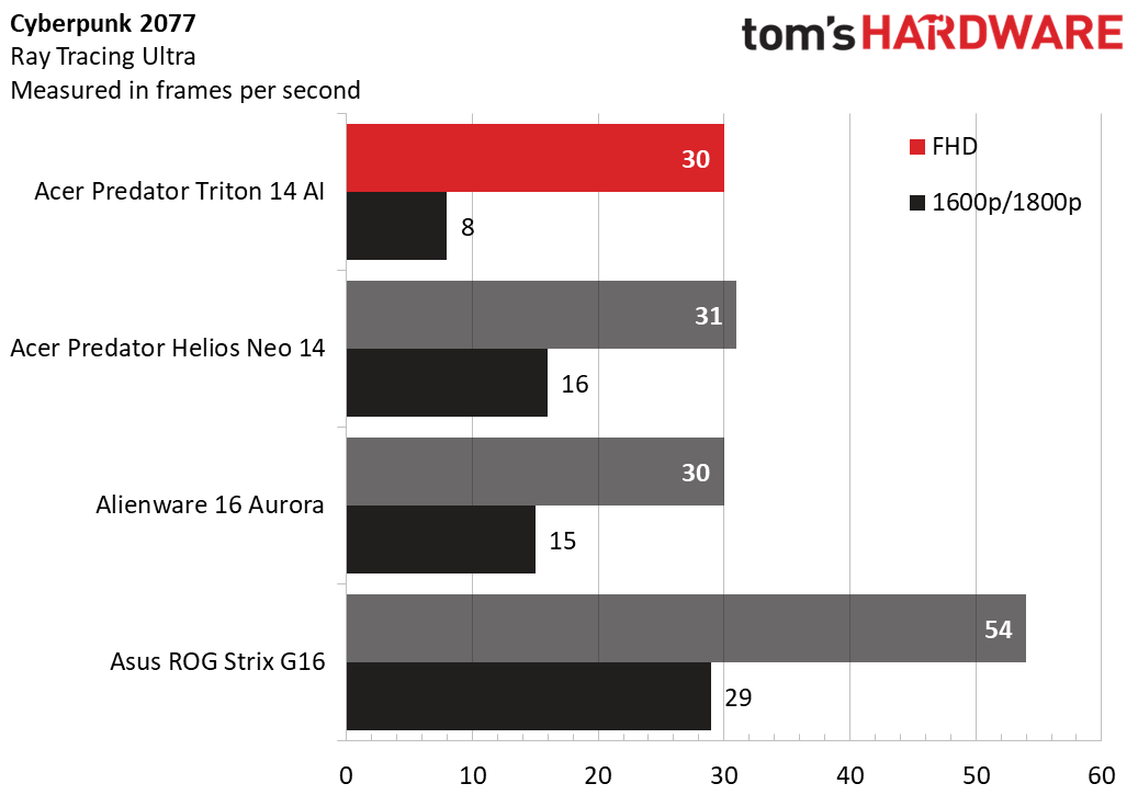 В Cyberpunk 2077 на требовательном пресете Ray Tracing Ultra ноутбук Triton показал 30 FPS при 1080p, идя ноздря в ноздрю с Helios (31 FPS) и Alienware (30 FPS). Но в родном разрешении его производительность упала всего до 8 FPS, тогда как Helios выдал 16 FPS, а Alienware — 15 FPS. Лидером снова стал Asus с 54 FPS при 1080p и 29 FPS в нативном разрешении.