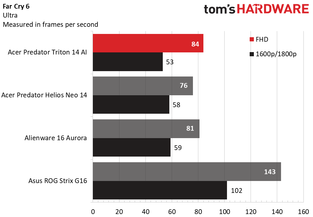 Triton хорошо показал себя в Far Cry 6 на настройках Ultra, достигнув 84 FPS при 1080p и обойдя Helios (76 FPS) и Alienware (81 FPS), хотя все еще сильно отставал от Asus (143 FPS). Результат 53 FPS в родном разрешении был достойным, отстав всего на пару кадров от Helios (58 FPS) и Alienware (59 FPS).