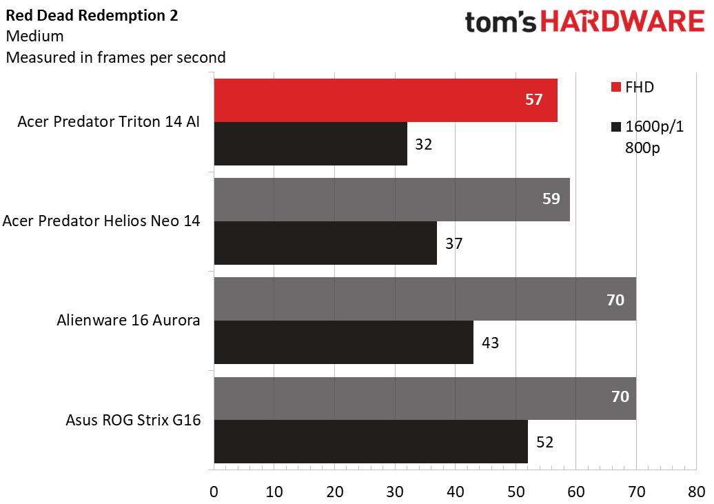 В Red Dead Redemption 2 на средних настройках Triton оставался конкурентоспособным, набрав 57 FPS при 1080p и 32 FPS в нативном режиме. Helios показал себя лучше (59 FPS и 37 FPS соответственно), а Alienware вырвался вперед с 70 FPS и 43 FPS. Asus ожидаемо доминировал с 52 FPS в нативном разрешении.