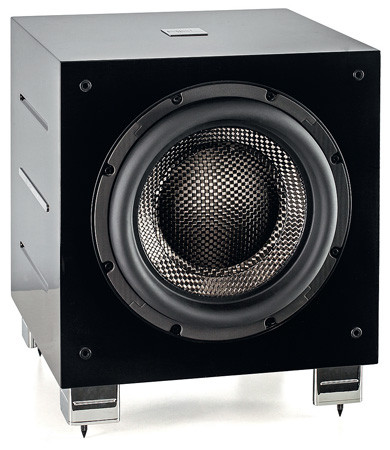 Сабвуфер довольно большой и тяжелый (В×Ш×Г: 45×40×44 см; вес 26,3 кг). Он оснащен 30-сантиметровым направленным вперед динамиком и встроенным в нижнюю грань пассивным радиатором того же диаметра с плоским диффузором. Его рекомендуется устанавливать в угол комнаты, следуя указаниям, подробно описанным в инструкции по эксплуатации.