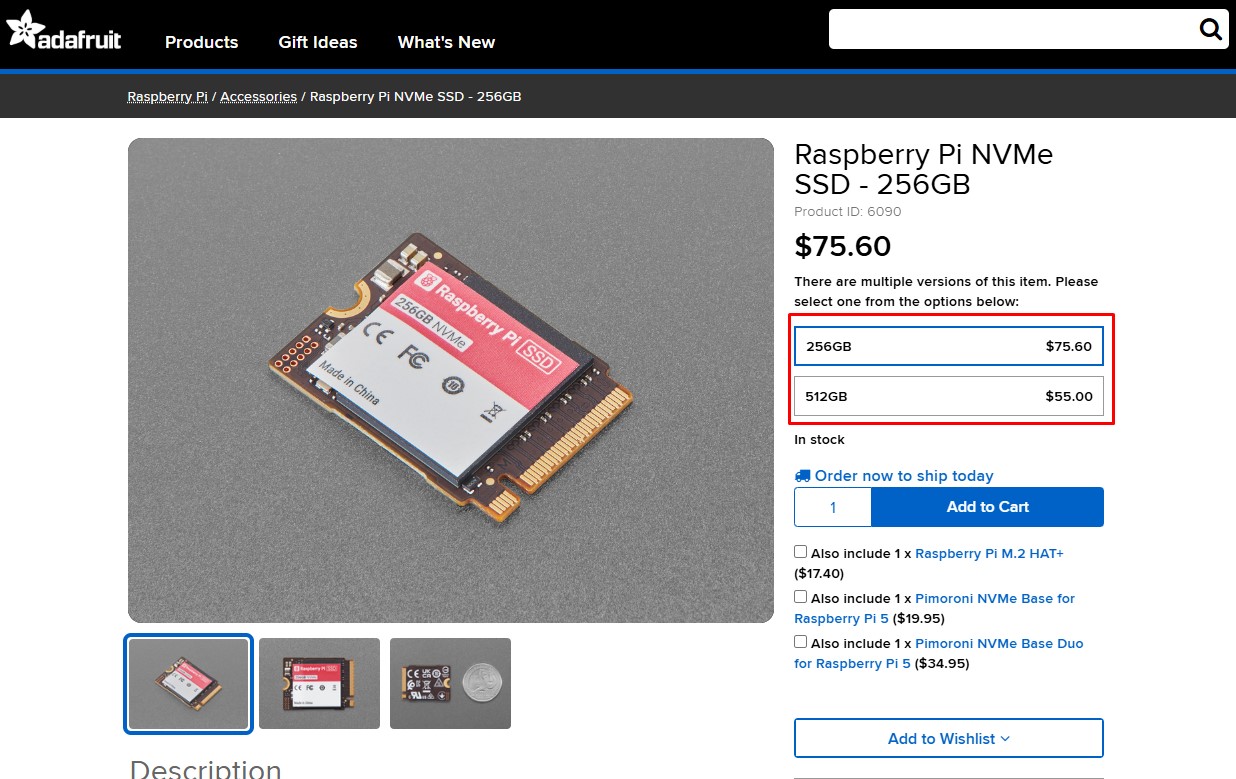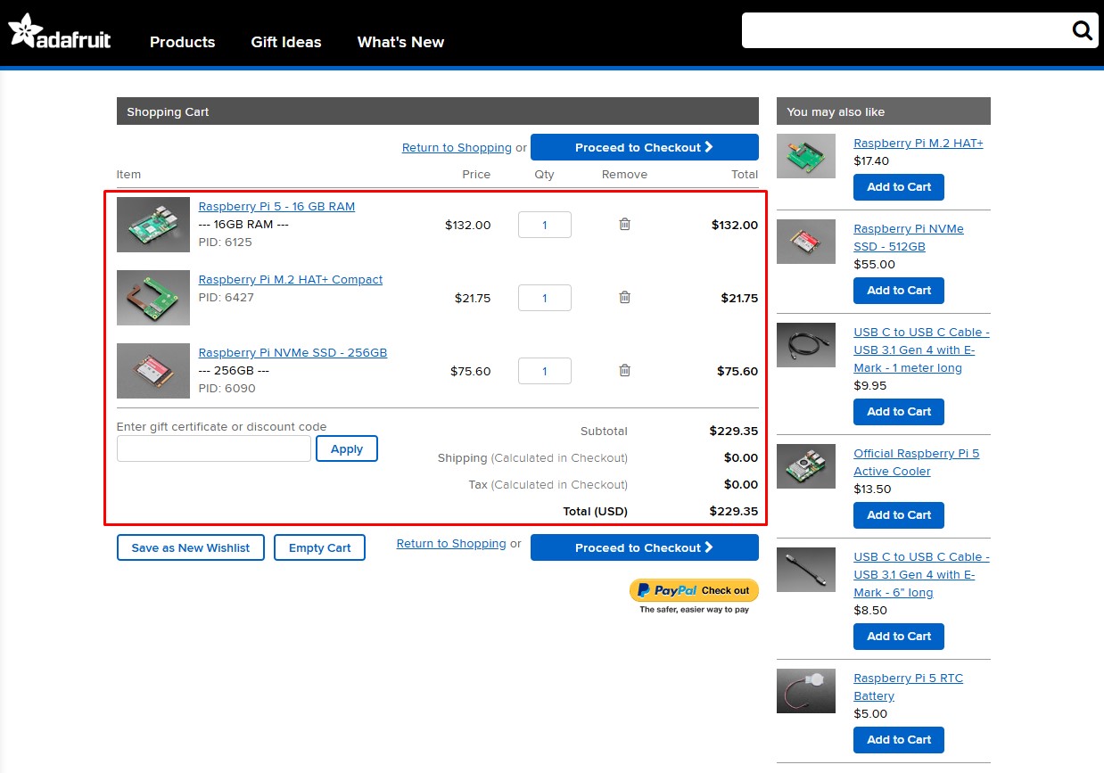 Мне не терпелось сравнить цены. Я собрал аналогичный комплект из компонентов: Raspberry Pi 5 (16 ГБ), новый компактный M.2 HAT и такой же NVMe SSD на 256 ГБ.
