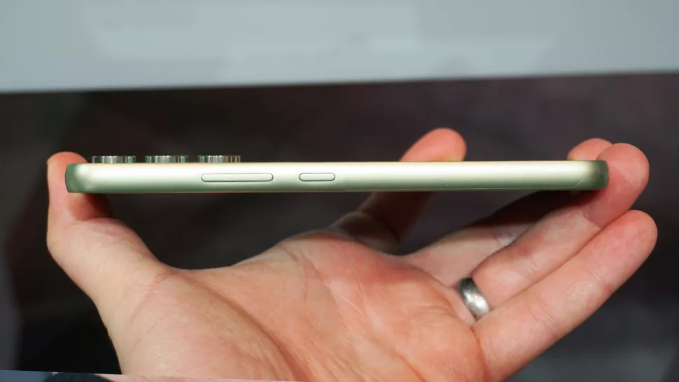 С его меньшим дисплеем, A54 немного толще, чем его предшественник, но, возможно, более заметно различие в весе. Увеличившись на 13 грамм между поколениями, A54 находится за порогом в 200 граммов (на 202 грамма), где вес смартфона начинает ощущаться в руке, особенно для его размера экрана. Тем не менее, он удобен в удержании, а конструкция кажется прочной (даже если пластиковая рамка выглядит несколько массивной пропорционально), усиленной сертификатом IP67 от пыли и воды для дополнительного спокойствия.