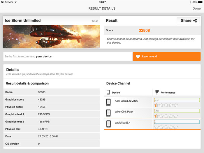 В тесте 3DMark Ice Storm Unlimited, который измеряет производительность в играх и при воспроизведении видео в высоком качестве, маленький iPad Pro показал на 53 более высокое быстродействие (33 292 балла), чем iPad Air 2 и незначительно отличающиеся результаты по сравнению с большим iPad Pro.