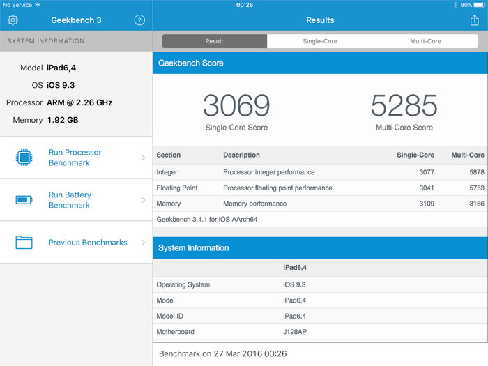 Чипы в маленьком iPad Pro заявлены те же, что и в большом – A9X и M9, наиболее производительные из тех, что встроены в мобильные устройства Apple. Тест Geekbench 3, разработанный для оценки производительности основного процессора, показал превосходство маленького iPad Pro перед iPad Air 2 на 88 процентов в одноядерном single-core и на 17 процентов — в многоядерном multi-core. При этом планшет слегка уступил в обоих тестах своему «большому брату».