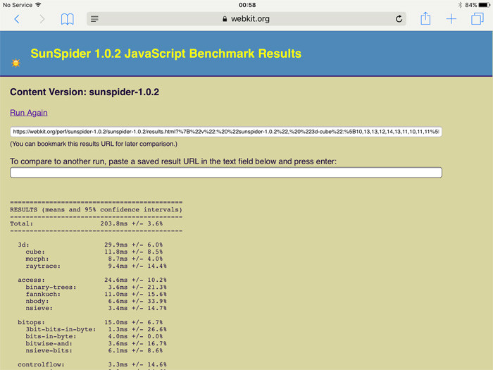 Наконец, браузерный тест SunSpider, оценивающий производительность процессора при работе в интернете, также выявил почти двукратное преимущество маленького iPad Pro над iPad Air 2: первый выполнял задания в среднем за 189 миллисекунд, a второй — за 308. Разница с большим iPad Pro вновь оказалась незначительной.