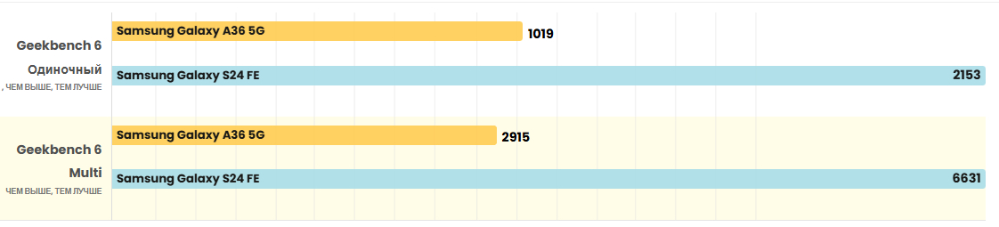 | Samsung Galaxy A36 5G | 1748(Хорошо) | 1126(Хорошо) | 1.6(Хорошо) | 6674 | 2.12 | 2.07(Хорошо) | 6.33(Среднее значение) |