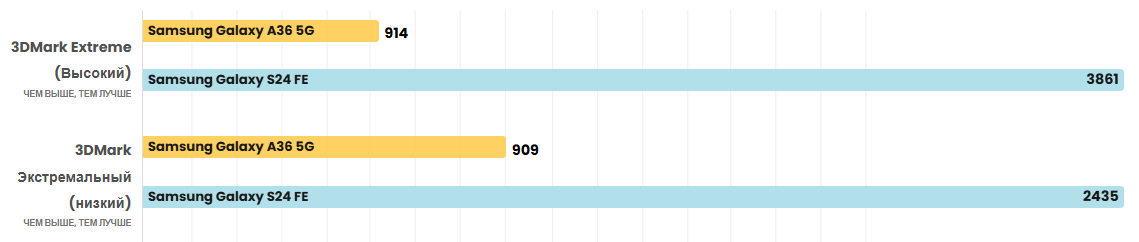 В проведённых нами тестах производительности графики 3DMark Galaxy S24 FE значительно превзошёл Galaxy A36 по производительности графики.