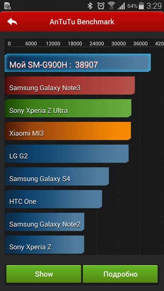 У меня на руках версия Galaxy S5 с чипсетом Samsung Exynos 5422 – то есть с 8 ядрами, которые работают кластерами по 4 штуки (ARM Cortex-A7 + ARM Cortex-A5), и графикой Mali-T628MP6. Параллельную работу всех ядер не реализовали, видимо, считают, что и так нормально. В AnTuTu моя версия SGS5 набирает что-то около 39 тысяч баллов.
