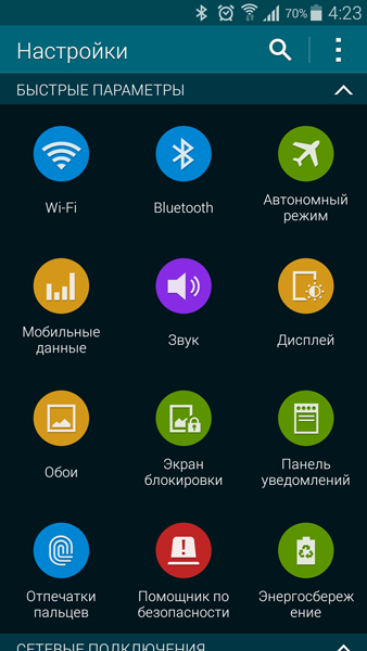 В-седьмых, софт. Это, как говорится, тема моей докторской (читай – мелких улучшений/изменений вагон – всех их здесь не опишешь), поэтому совсем коротко. Оболочку TouchWiz, натянутую поверх Android 4.4.2, в очередной раз допилили. Она вроде бы стала несколько легче визуально, но меню настроек по умолчанию отображается вот так: