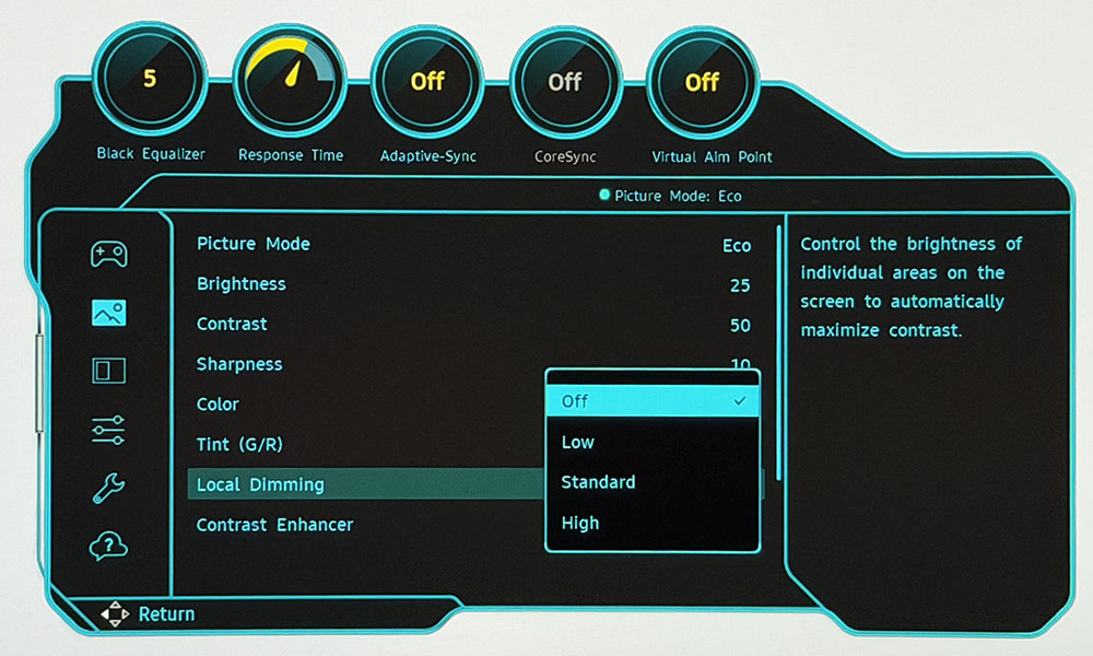 Монитор Odyssey G7 можно использовать без калибровки в режиме Eco (Эко). Несмотря на название, он не ограничивает яркость и полностью настраивается. Я подправил ползунки RGB, которые очень точны, и отрегулировал гамму, чтобы получить небольшое улучшение качества. Главное улучшение заключалось в немного большей насыщенности цвета, что, безусловно, хорошо. Мои настройки показаны ниже. Для HDR-контента я рекомендую включить динамическое тональное отображение и установить локальное затемнение на высокий уровень.