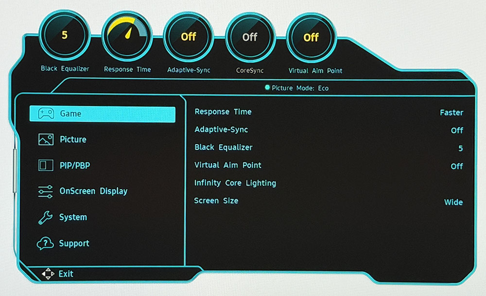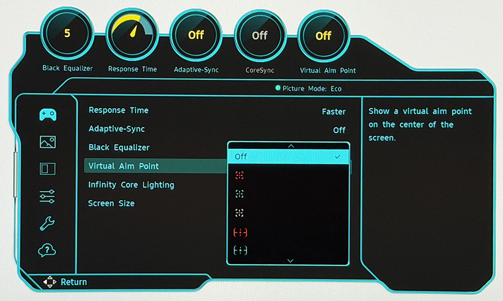 В игровом меню (Game) есть трехуровневая регулировка времени отклика (Overdrive), переключатель Adaptive-Sync, эквалайзер черного и выбор точек прицеливания. Я заметил, что одновременно использовать Adaptive-Sync и Overdrive нельзя, что необычно. Однако, если вам удается поддерживать частоту кадров 180 fps, это не критично. Также отсутствует функция стробоскопической подсветки (BFI).