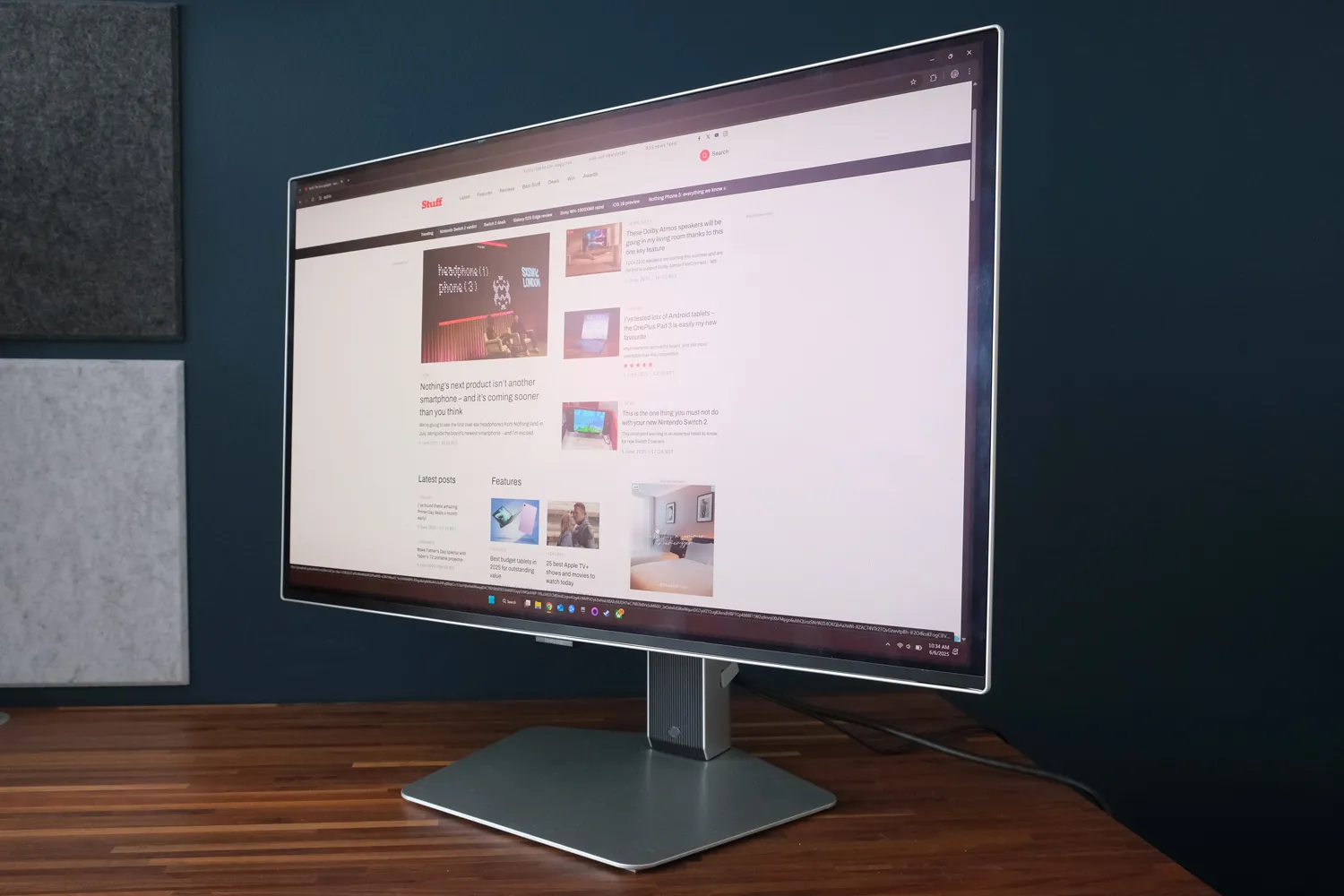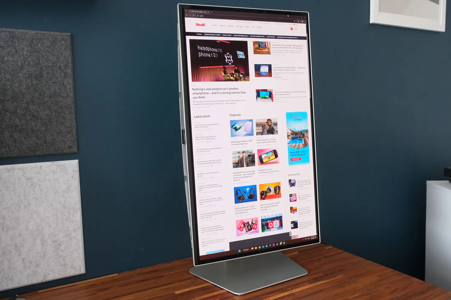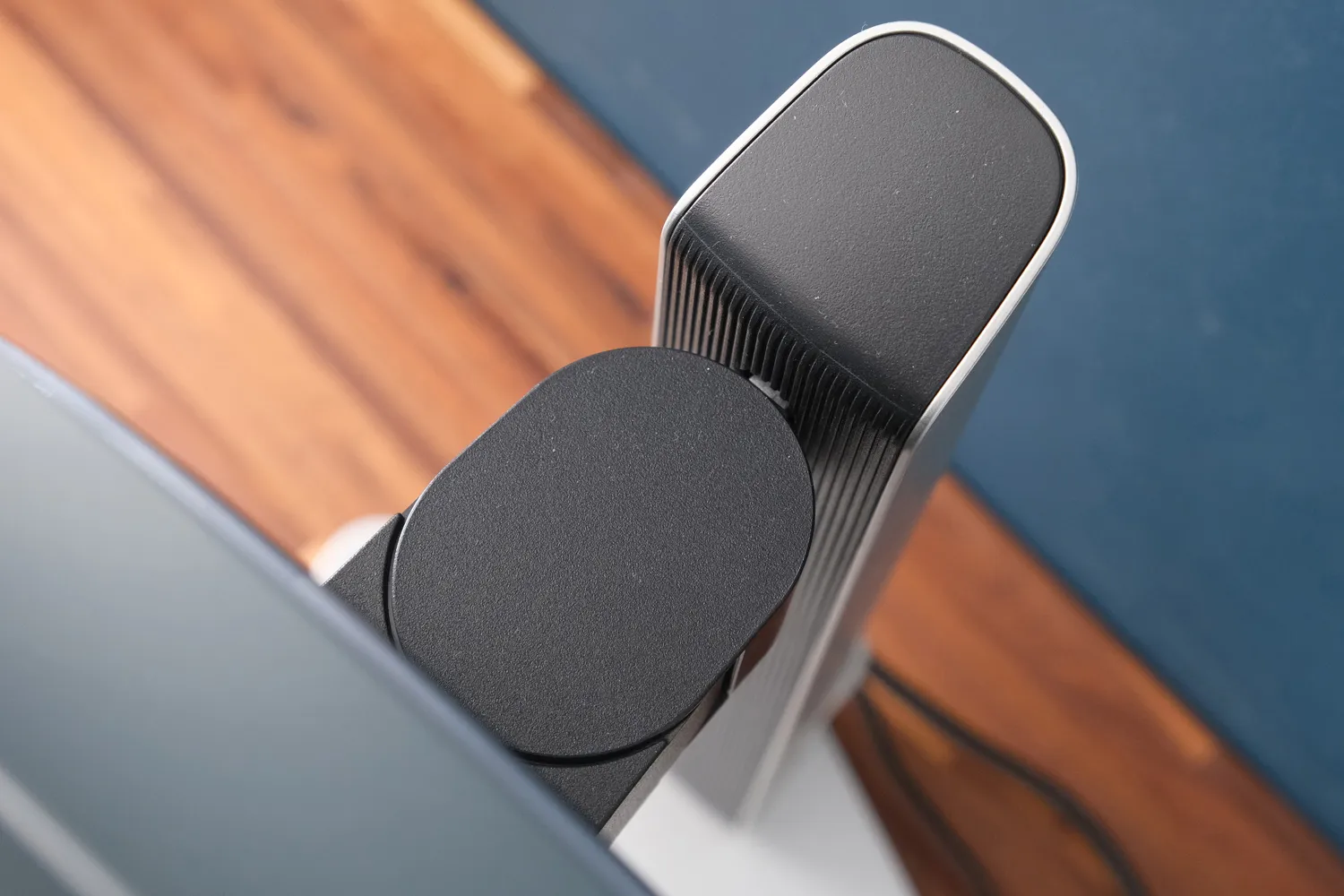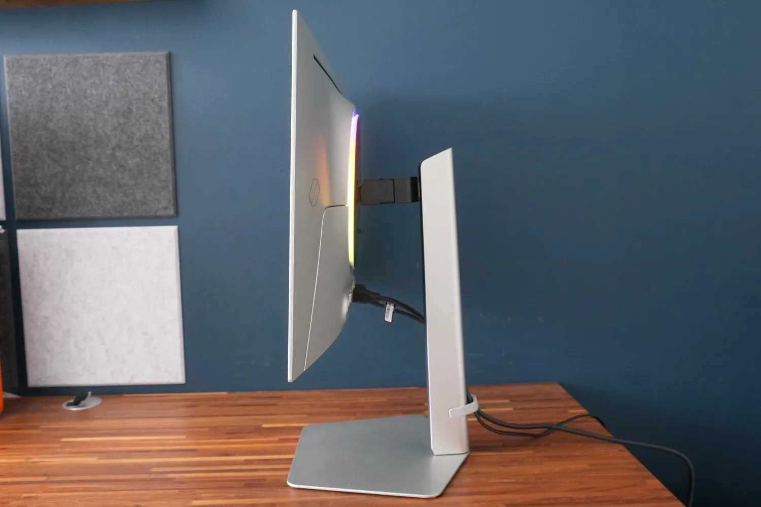 Несмотря на то, что он такой тонкий, подставка очень прочная и легко регулируется. Она наклоняется, поворачивается и имеет достаточную регулировку по высоте, а также может поворачиваться на 90 градусов, если вам нужен дисплей в портретном режиме. Разумеется, она также совместима с креплениями VESA.
