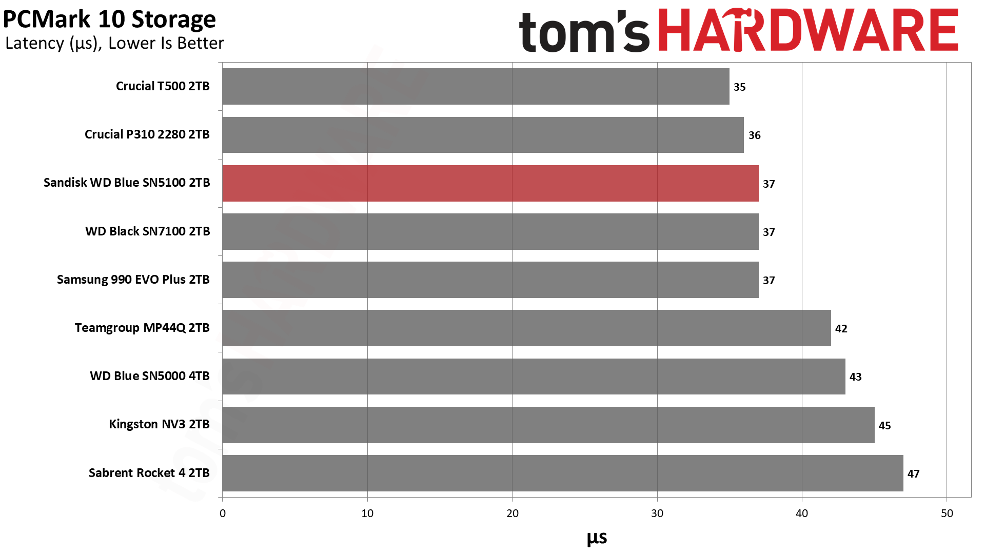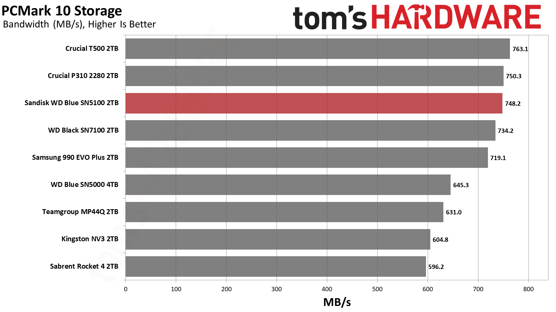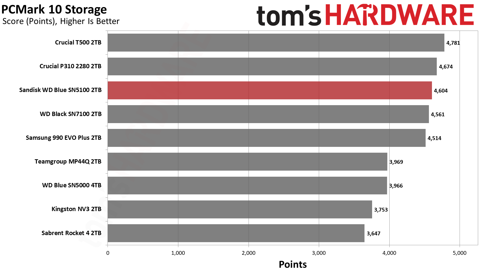 Производительность Blue SN5100 в PCMark также превосходна. Она находится на одном уровне с Crucial T500 и P310. Результаты близки к показателям Black SN7100, что неудивительно, поскольку оба накопителя используют очень похожее «железо». В режиме псевдо-SLC (pSLC) — а большинство тестов и реальных задач попадают именно в эту категорию — накопители должны работать одинаково.