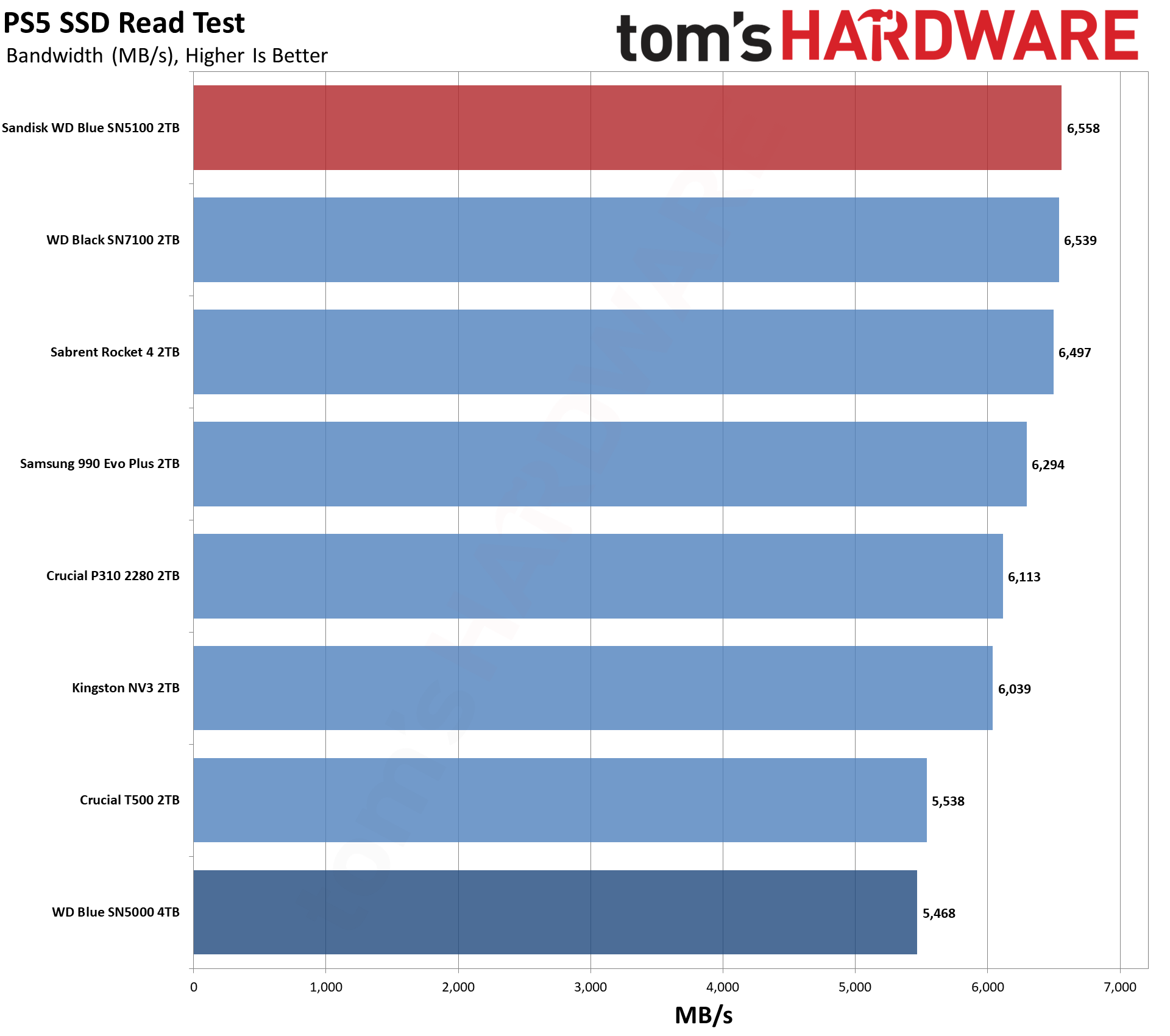 Blue SN5100 использует интерфейс PCIe 4.0, что делает его хорошим выбором для PS5 (PCIe 5.0 для консоли избыточен), так как он раскрывает свой потенциал пропускной способности. Хотя технически задержки у флеш-памяти QLC выше, чем у TLC, в реальных сценариях чтения игр это не заметно благодаря оптимизации.
