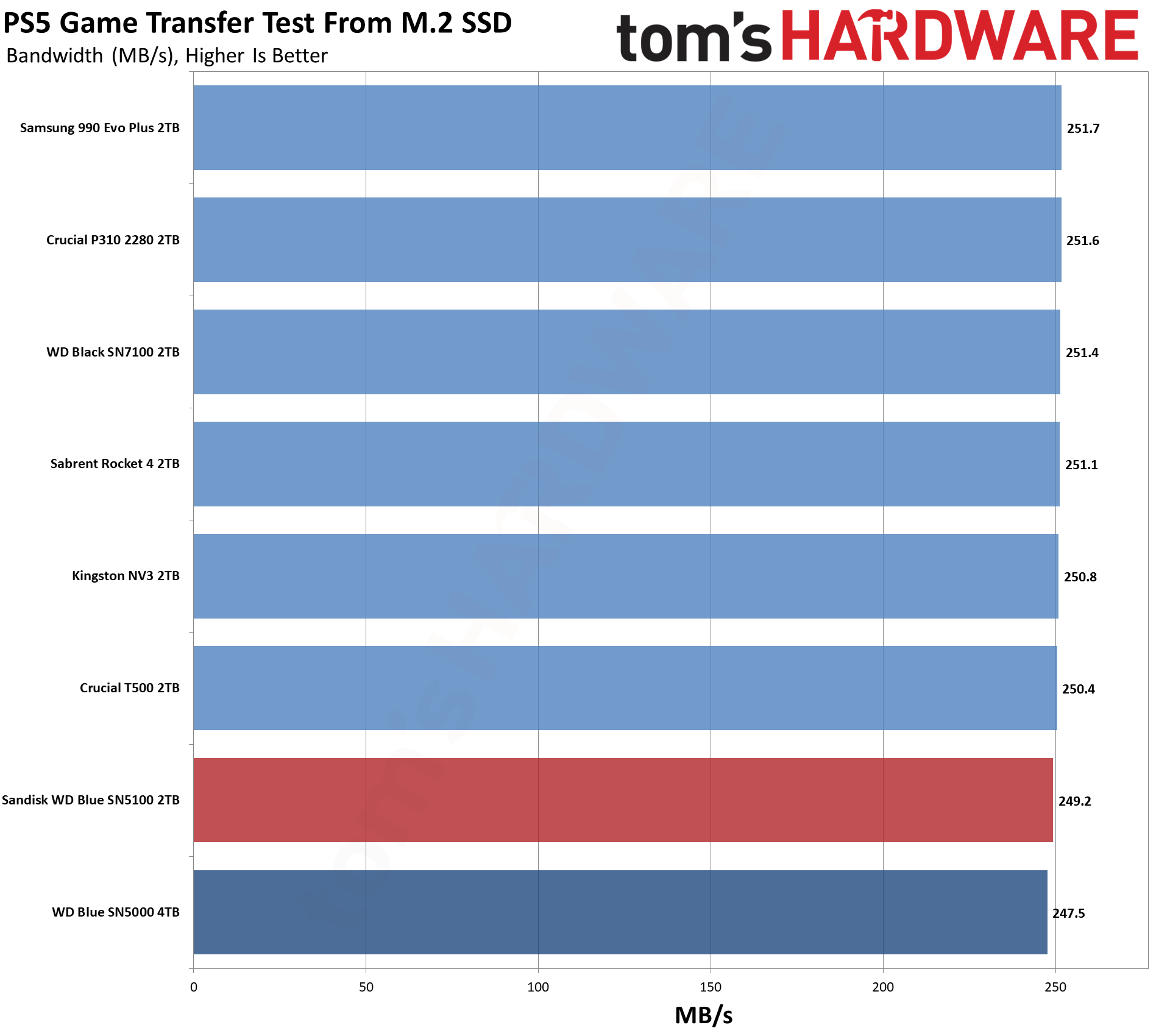 С другой стороны, Blue SN5100 часто прыгает выше головы и может составить конкуренцию даже старшему брату Black SN7100. При адекватной цене это будет лучший диск в своем классе. Большинство пользователей никогда не столкнутся с его низкой скоростью прямой записи. Это отличный выбор для игрового ПК или апгрейда ноутбука, особенно версии на 4 ТБ.