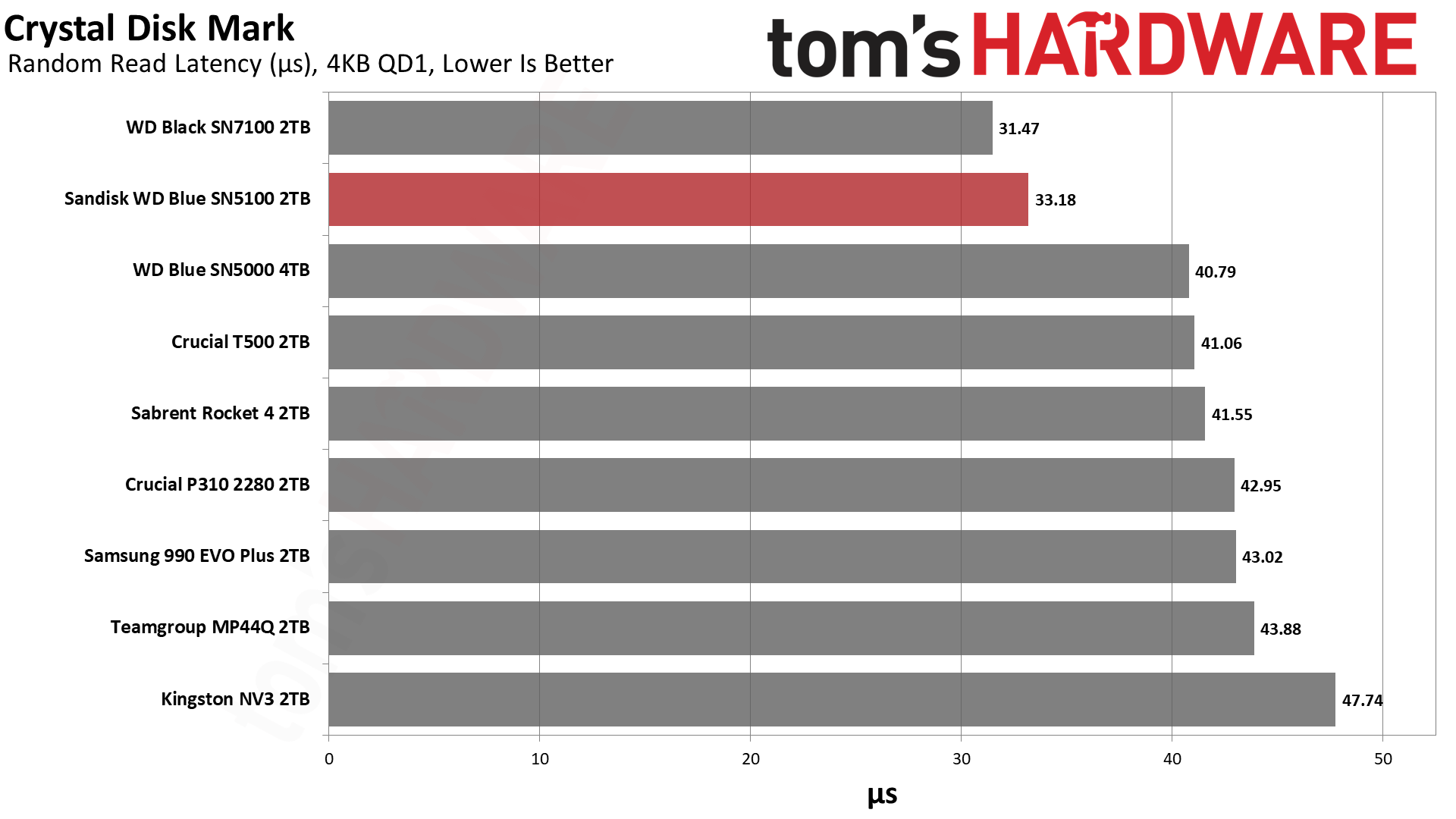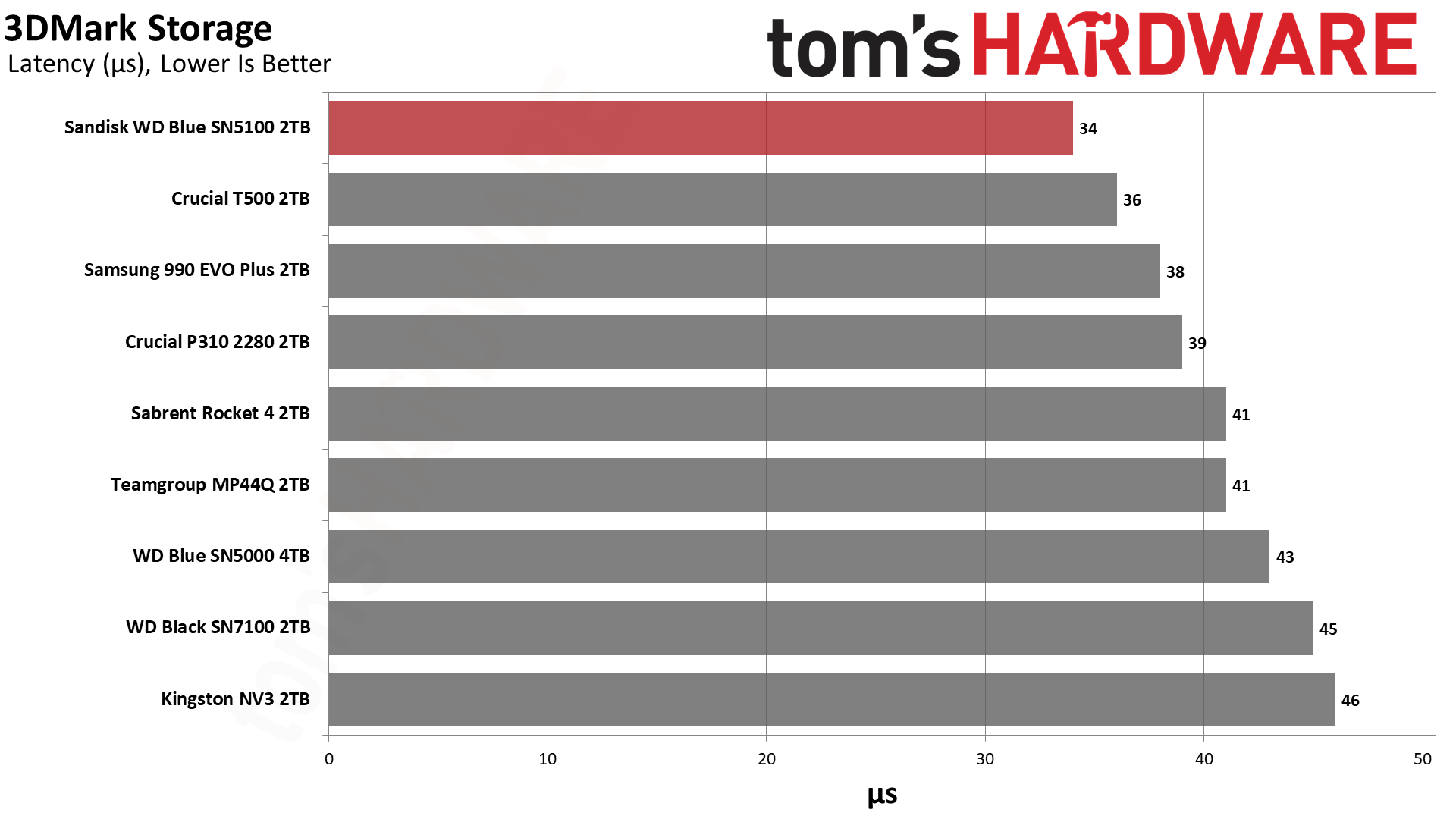 С учётом этого, мы видим, что T500 выходит на первое место, а Blue SN5100 уверенно занимает второе. Его производительность практически такая же, как у Black SN7100. Crucial P310 использует то же поколение памяти Micron, но в четырехплоскостной конфигурации QLC, что может влиять на задержки. Память BiCS8 в накопителе Sandisk также имеет четырехплоскостную структуру.