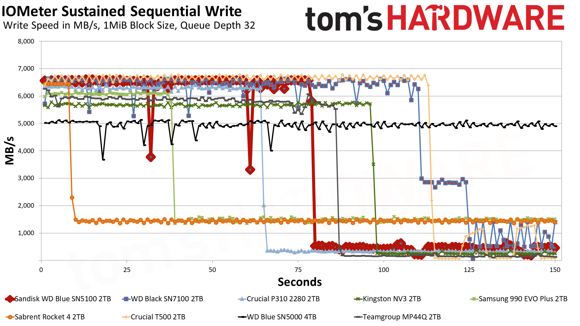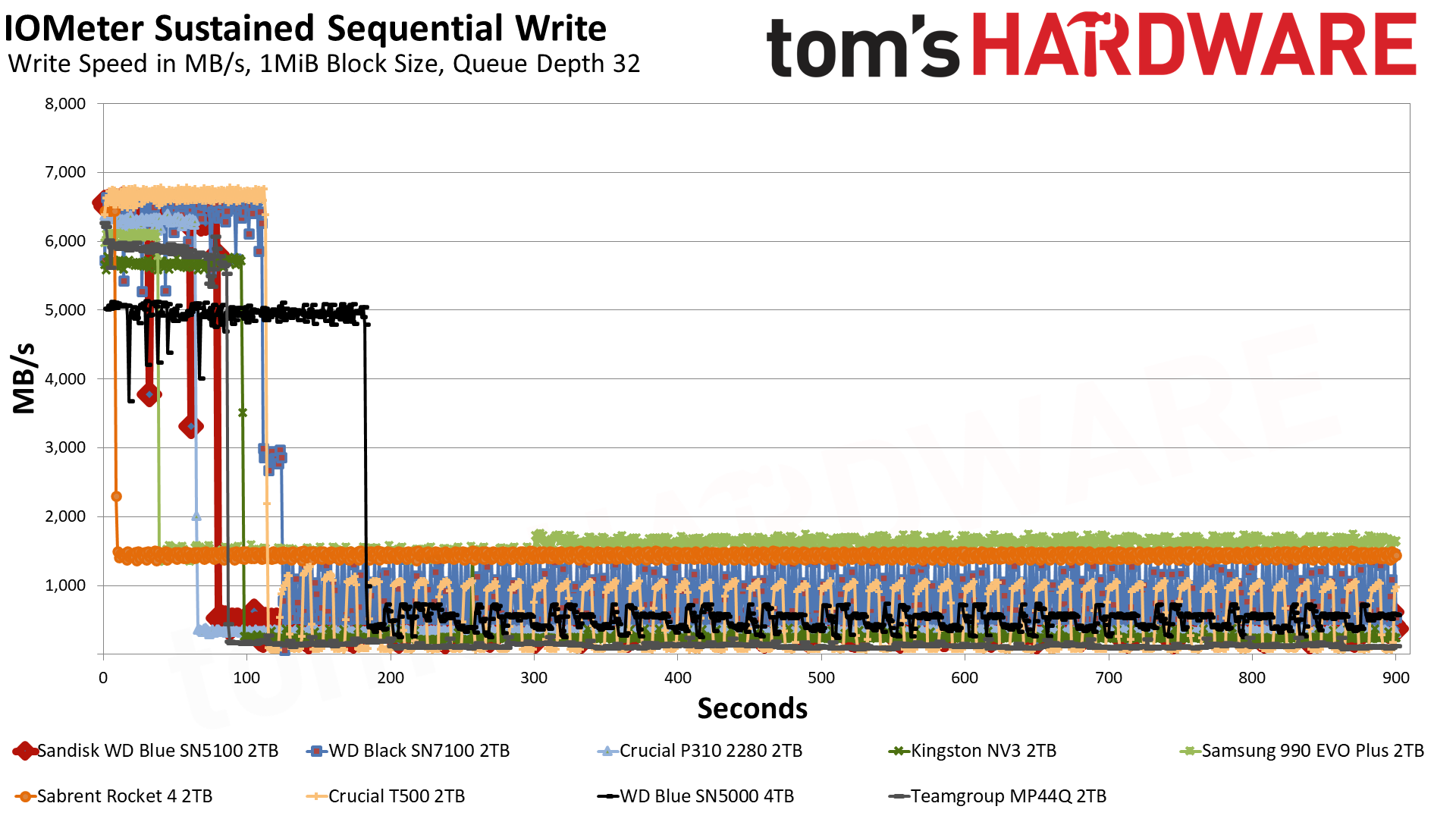 В нашем тесте модель Blue SN5100 на 2 ТБ могла записывать данные со скоростью 6,45 ГБ/с более 78 секунд. Объем кэша превышает 500 ГБ, что составляет около четверти от всего объема флеш-памяти (максимум для QLC).