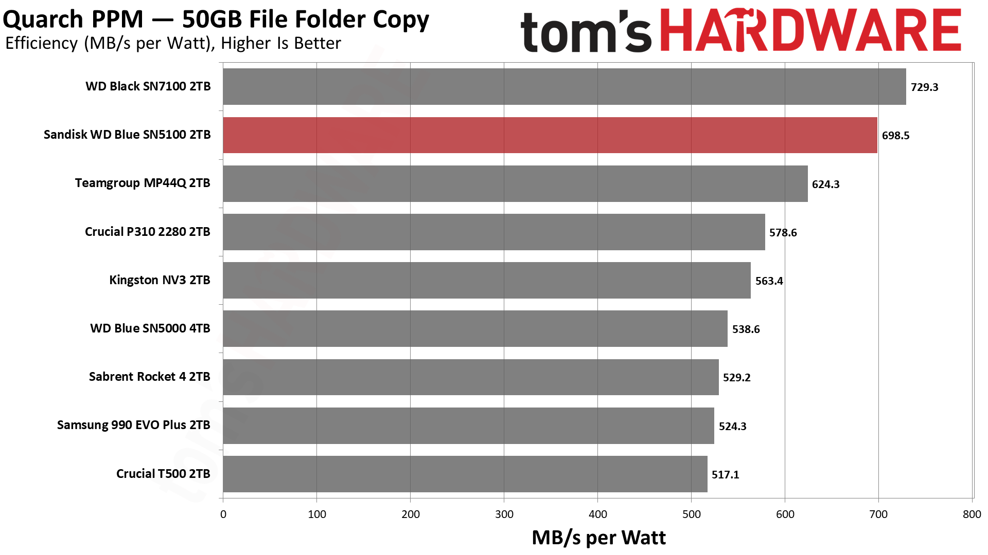 Blue SN5100, как и ожидалось, фантастически энергоэффективен. Это отличный выбор для ноутбуков, где важен каждый ватт и градус. Контроллер Sandisk в паре с памятью BiCS8 показывает отличные результаты. Стоит отметить, что Black SN7100 (TLC) также очень эффективен, что говорит о грамотной оптимизации всей платформы.