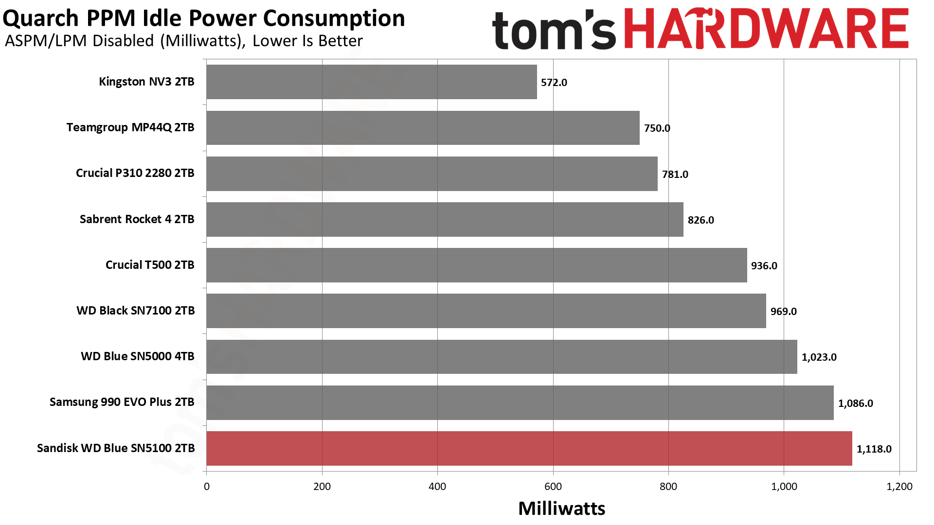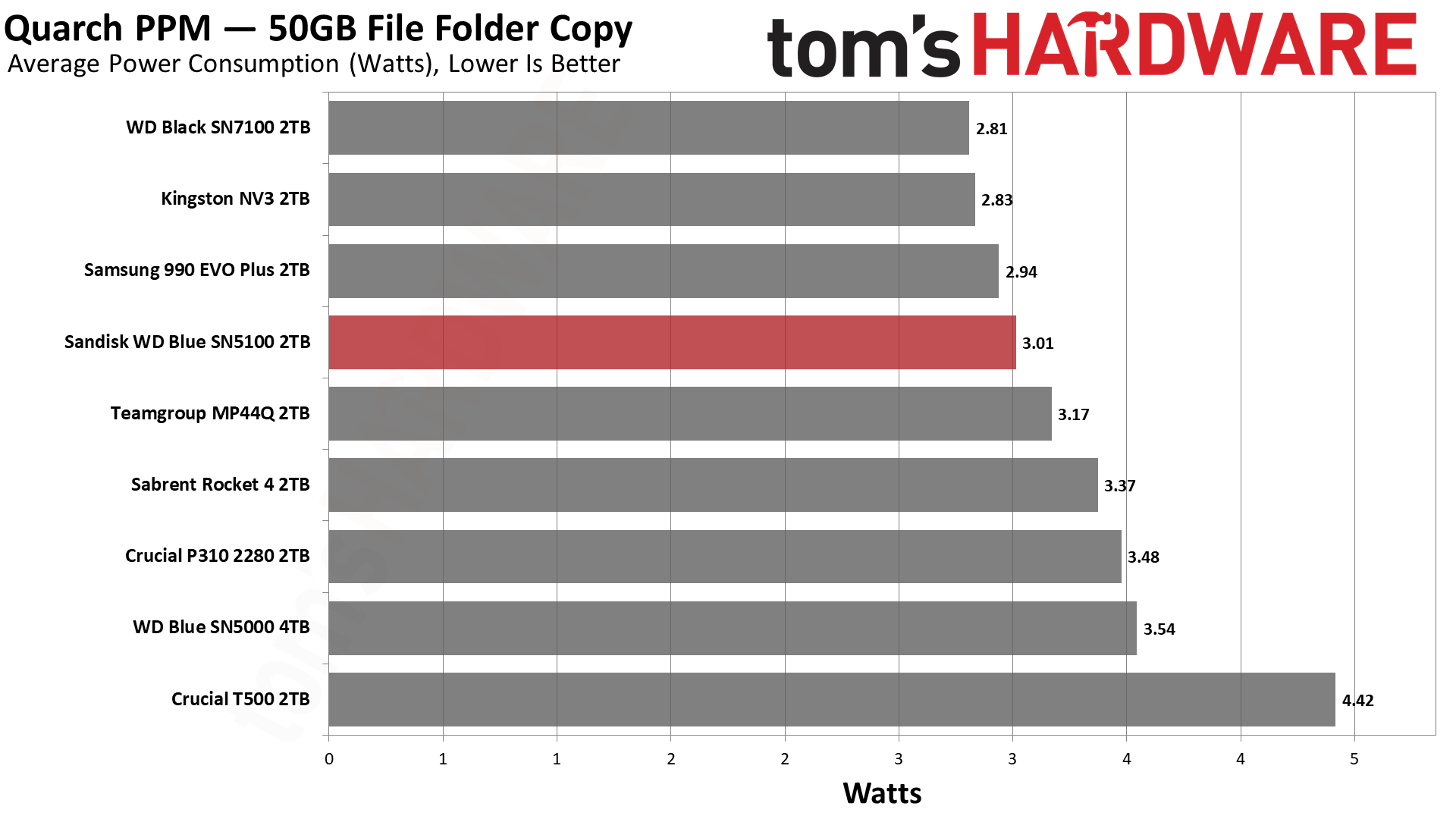 Мы используем оборудование Quarch HD для точного измерения энергопотребления. Эффективность (МБ/с на Ватт) важнее простого потребления, так как быстрый диск быстрее закончит задачу и уйдет в сон.