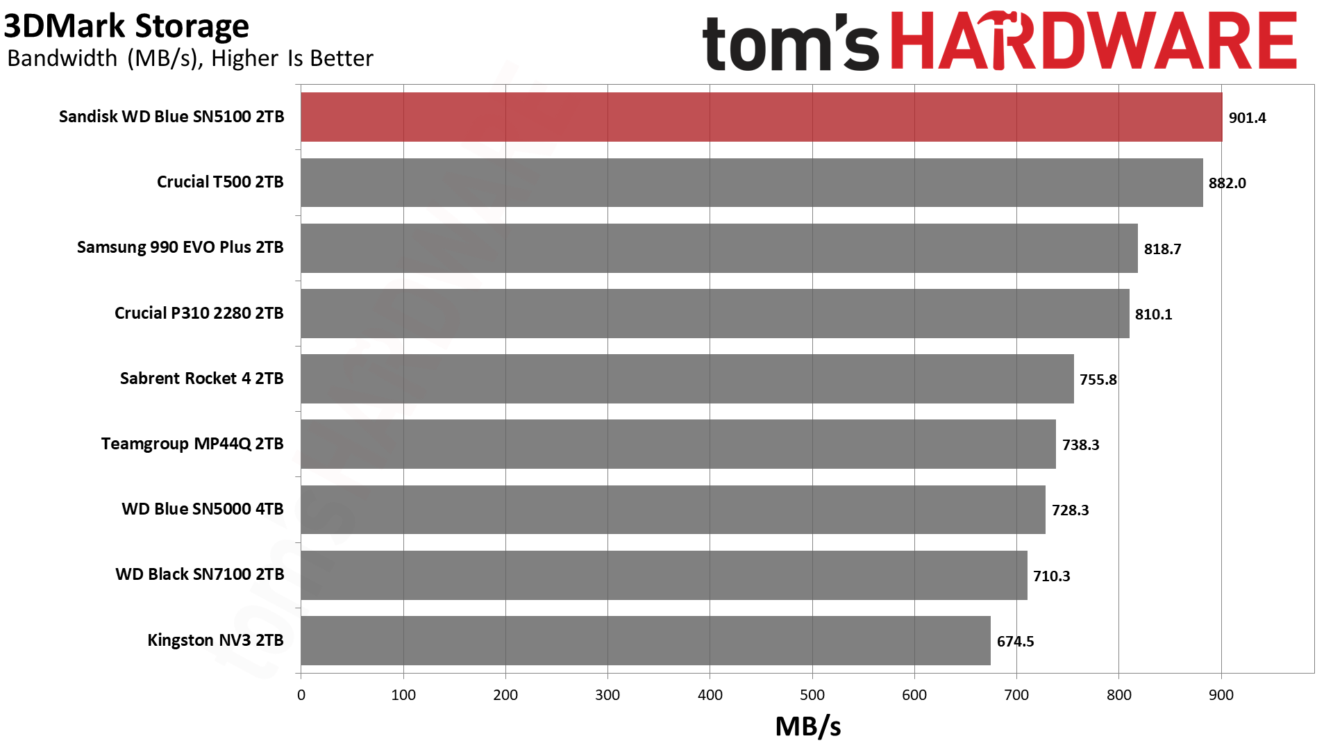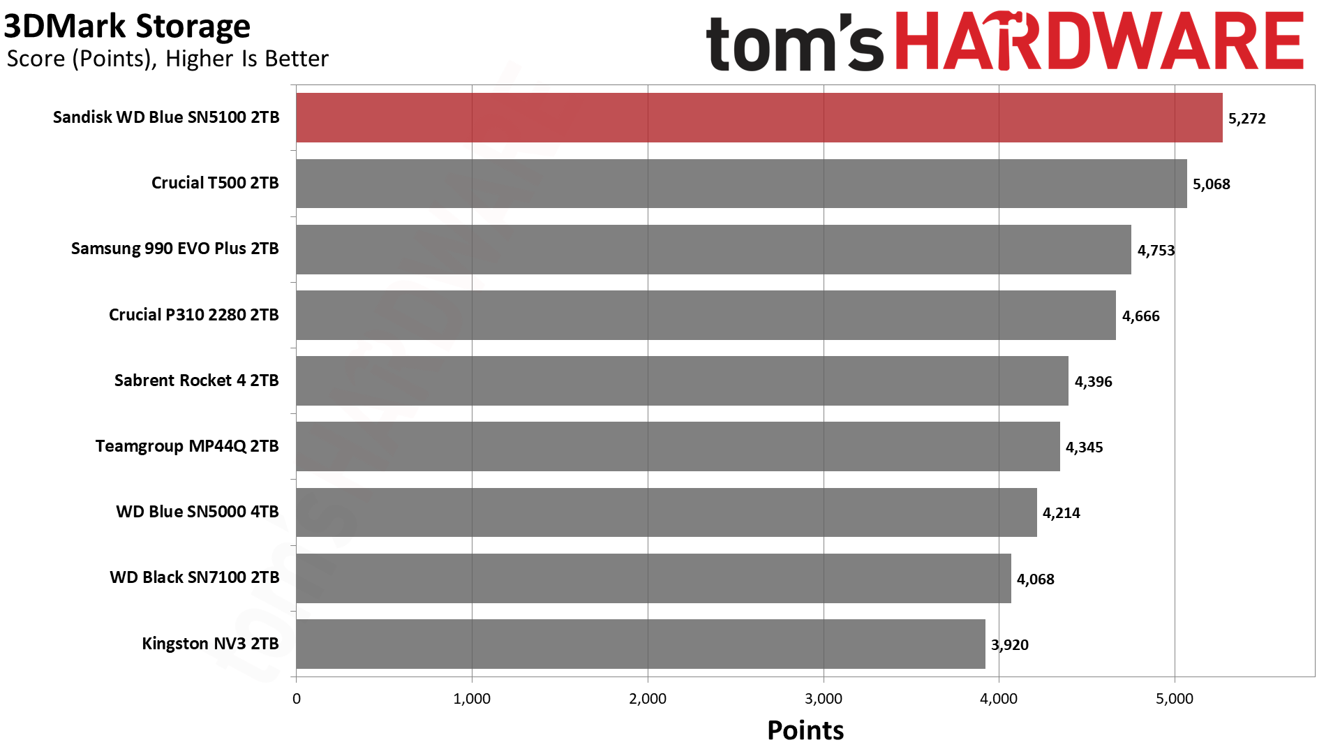 Blue SN5100 занял первое место в нашем тесте 3DMark. Это означает, что он обходит даже Crucial T500, оснащенный DRAM-буфером. Такой результат делает его отличным выбором в качестве второго диска для игр, даже по сравнению с такими моделями, как Samsung 990 EVO Plus, которые зачастую стоят дороже.