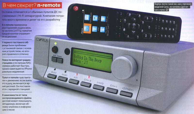 Это первый из трех сетевых клиентов Cyrus – и единственный, снабженный встроенным усилителем мощностью 30 Вт на канал. У него тот же корпус, что и у других двухканальных компонентов производителя. На лицевой панели расположены кнопки управления и ручка для навигации по меню. Дисплей читается не очень четко, а бегущий текст порой мерцает; однако стоит взять в руку новый пульт ДУ «n-remote», как вы забудете об этом. Компания изрядно вложилась в разработку и программирование, чтобы создать собственный универсальный пульт, способный выполнить практически любые пожелания пользователя.