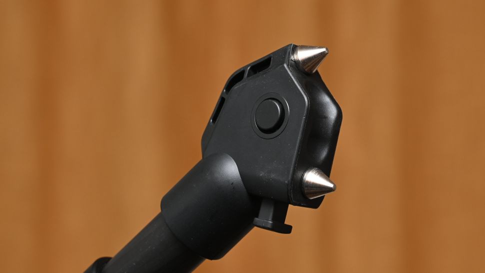 Если двигаться вниз от головы, то можно увидеть кнопку блокировки/разблокировки для выдвижения центральной стойки, в нижней части которой находится съемный утяжелитель. Ножки имеют три разных угла фиксации, причем более широкие углы удобнее для стрельбы с низкого уровня или для обхода препятствий. На ножках есть резиновые накладки, которые снимаются, открывая двойные шипы, что позволяет использовать их на разных типах твердой и мягкой поверхности.