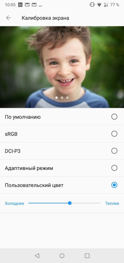 Можно также поиграться со цветовой температурой в меню «Калибровка экрана», выбрав один из предложенных режимов или просто настроив ее ползунком.