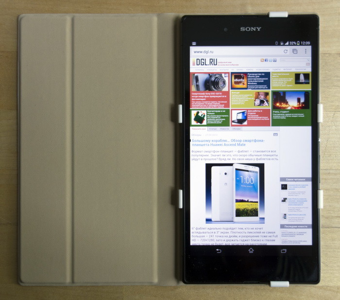 Качество картинки меня вполне устроило. Экран четкий, с добротной цветопередачей. Черный похож на черный (хотя на самом деле, конечно, слегка сероват). Подсветка равномерная, без раздражающих пятен по углам. Веб-странички, фотографии, кино – все смотрится отлично. К сожалению, Z Ultra, в отличие от той же Sony Tablet Z, лишен магнитной защелки, позволяющей ему включаться при открытии лицевой крышки чехла. Приходится нажимать на кнопочку. Ну да ничего, мы парни привычные.