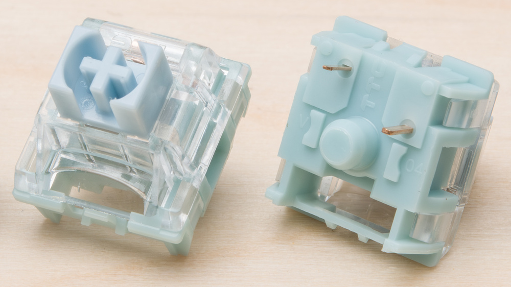 Эти переключатели имеют голубую ножку и нижний корпус, а также прозрачный верхний корпус, что обеспечивает хорошую видимость RGB-подсветки. Благодаря двухступенчатым пружинам они обеспечивают удивительно приятное тактильное ощущение при наборе текста средней тяжести с относительно коротким предварительным ходом, мягким нажатием и быстрым возвратом. У них также довольно небольшой общий ход, поэтому они лучше всего подходят для более лёгкого нажатия, чтобы избежать ощущения резкого нажатия до упора. Эти переключатели — ваш лучший выбор, если вы особенно чувствительны к шуму или живете с кем-то, кто так чувствителен.