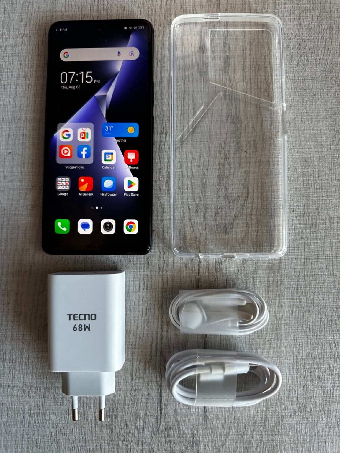 Упаковка Tecno Pova 5 Pro впечатляет. Треугольная коробка, украшенная ярким узором в виде катушки, сразу же привлекает внимание. Золотой логотип сертификации Hi-res Audio на лицевой стороне намекает на качество звука, который вас ожидает. Открыв упаковку, вы обнаружите компактную коробку, в которой находится телефон, защитный чехол, кабель Type-C, зарядное устройство с поддержкой 68 Вт, проводные наушники, а также руководство пользователя и гарантийный талон. Примечательно, что наличие наушников с микрофоном свидетельствует о стремлении Tecno удовлетворить потребности геймеров.
