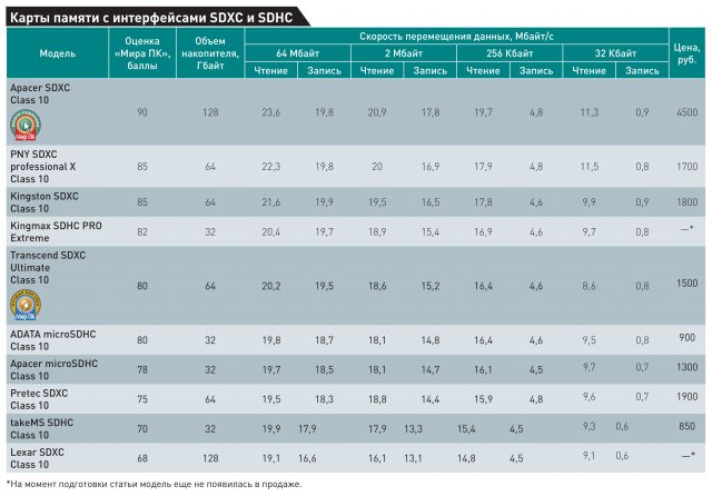 Наше тестирование показало, что проведение анализа максимальной скорости современных накопителей формата SDXC существенно затрудняют ограничения, налагаемые устройствами чтения карт памяти. Конечно, можно было бы найти специальный адаптер PCIe-SD и выяснить, какая из карт обладает максимальным быстродействием в идеальных для нее условиях, но, на наш взгляд, это было бы неправильно, ведь подобные переходники в повседневной жизни встречаются довольно редко. Именно поэтому одним из главных критериев стала скорость записи при работе с файлами небольшого объема. Лидирующей по данному показателю оказалась карта Apacer SDXC Class 10, по праву заслужившая значок «Выбор редакции». А вот «Лучшей покупкой» мы решили назвать Transcend SDXC Ultimate Class 10. На наш взгляд, именно она обладает оптимальным соотношением цена/качество.