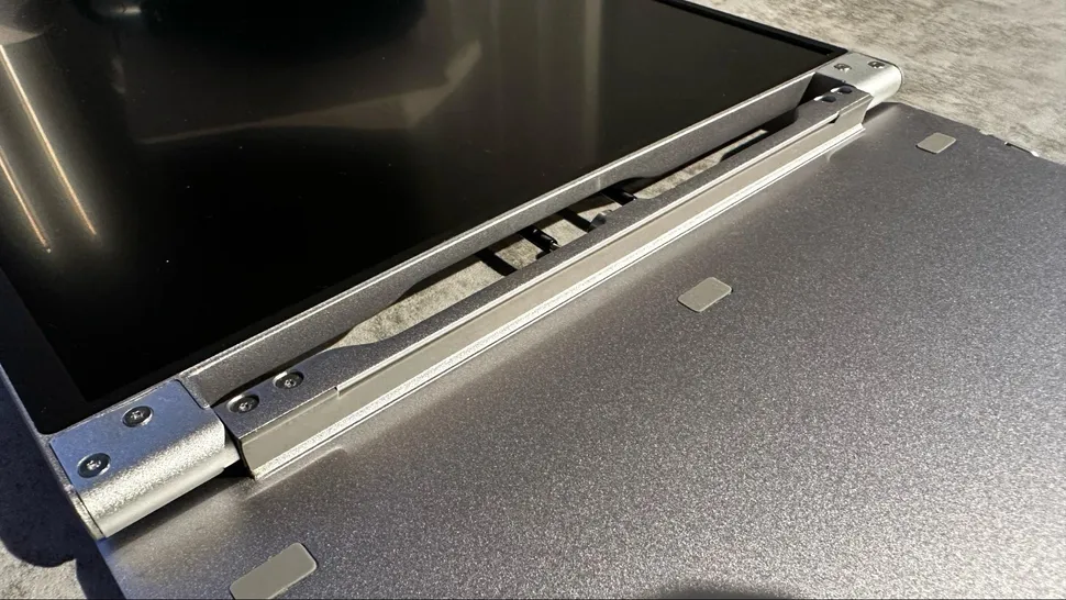 Затем вам нужно развернуть оба дисплея и внутренние створки, которые находятся за дисплеем вашего ноутбука. Эти внутренние створки подпружинены и оснащены двумя металлическими кольцами, за которые нужно потянуть пальцами, чтобы выдвинуть их. Если отпустить кольца, края внутренних створок плотно «захватят» боковую часть внутреннего дисплея вашего ноутбука. Сила зажима была достаточно большой, чтобы LK14 легко держался на моём 14-дюймовом MacBook Pro. LK14 поддерживает ноутбуки с диагональю экрана от 13 до 16 дюймов.