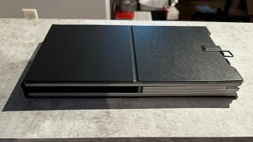 Благодаря корпусу из алюминиевого сплава LK14 идеально сочетается с Apple MacBook Pro. Цветовая гамма не сочетается с большинством ноутбуков на Windows, у которых обычно более тёмные крышки дисплеев. Когда вы достаёте LK14 из прилагаемого чехла в виде книги, он сложен, а для защиты двух экранов в него вложен пенопластовый блок.