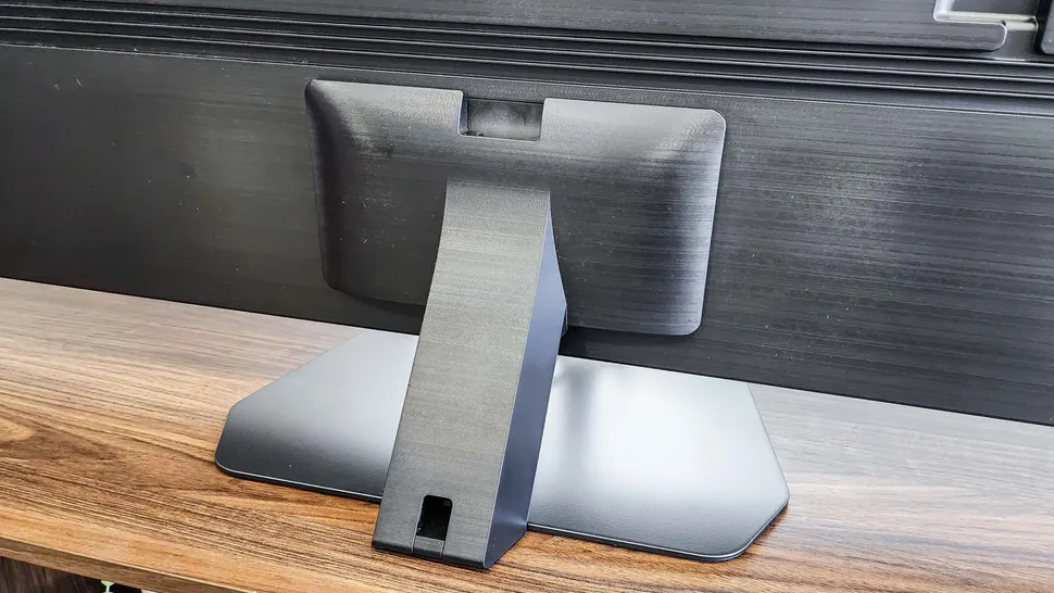 Тонкая (одна восьмая дюйма) тёмно-серая металлическая рамка обрамляет экран слева, справа и сверху, а снизу она немного шире (одна треть дюйма). Единственное другое заметное украшение на передней панели — небольшая чёрная бирка с логотипом Samsung, которая также закрывает аппаратные элементы управления, позволяющие включать и выключать телевизор, переключать каналы, регулировать громкость и выбирать источник сигнала без использования пульта дистанционного управления.