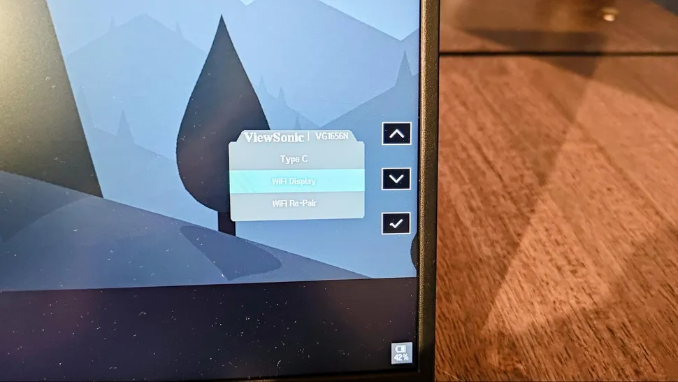 Единственные доступные настройки изображения — регулировка яркости или контрастности. Для дисплея не предусмотрены дополнительные цветовые режимы или опции HDR. В меню звука можно выбрать одну из трёх настроек: «Стандарт», «Голос», «Кино» и «Музыка». Единственная другая примечательная опция — «Выбор входа», которая предлагает три варианта: USB-C, отображение через Wi-Fi и повторное сопряжение через Wi-Fi. Первые две настройки не требуют пояснений, а третья восстанавливает соединение между беспроводным адаптером USB-C и VG1656N в случае возникновения проблем.