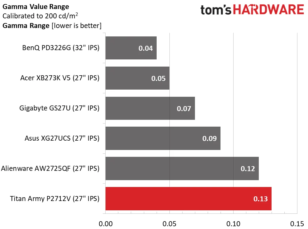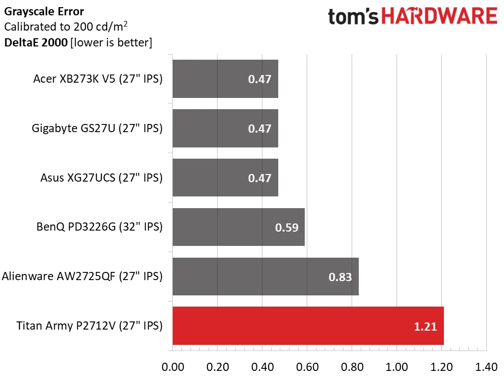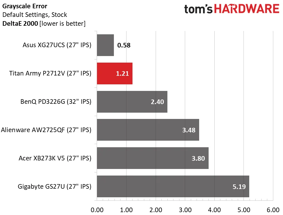 При настройках по умолчанию P2712V превосходит всех конкурентов, за исключением Asus XG27UCS, который демонстрирует исключительную точность отображения оттенков серого. Показатель 1,21 dE — отличный результат. После калибровки другие мониторы показывают лучшие цифры, но визуально разницы между лучшим и худшим результатами в этой группе нет. Это превосходная производительность.