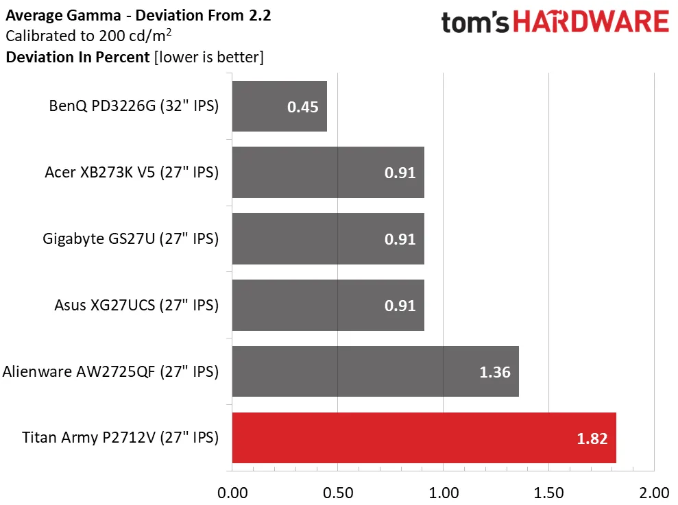 Ни один из мониторов не имеет существенных цветовых искажений; все они показывают достойные результаты. P2712V занимает пятое место с показателем 1,79 dE, но это все еще значительно ниже видимого порога в 3 dE. Хотя я не привел график для sRGB, у P2712V ошибка в этом цветовом пространстве ниже, чем у других экранов.