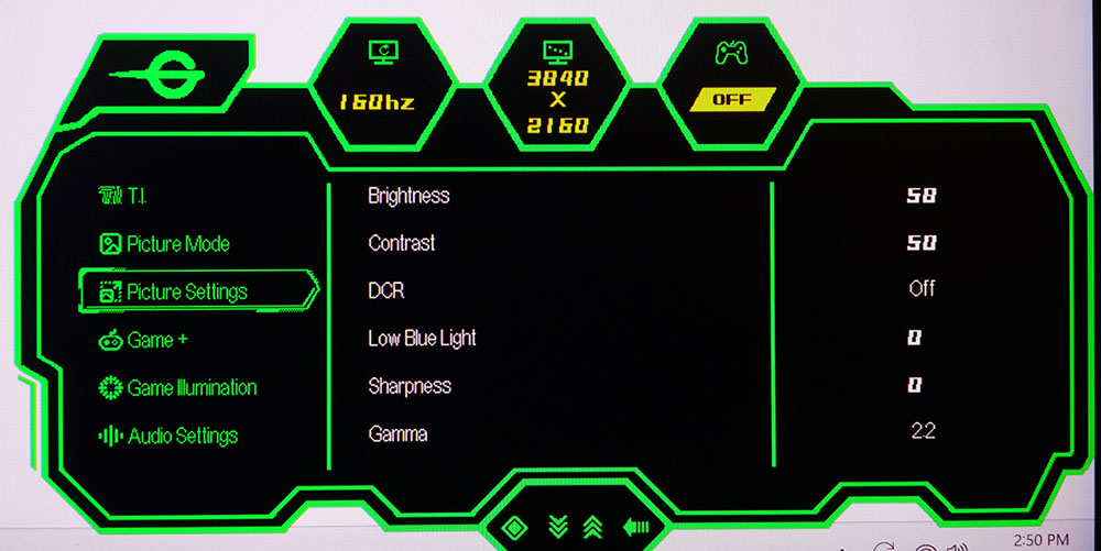 Экранное меню (OSD) появляется при нажатии любой клавиши и имеет функциональный дизайн, подходящий для игр. Разрешение и частота обновления отображаются в верхней части всех экранов. Начиная с меню «Game+», мы видим точки прицеливания, ночное видение и два снайперских режима. Также имеется переключатель двух режимов, позволяющий выбирать между 160 и 320 Гц.