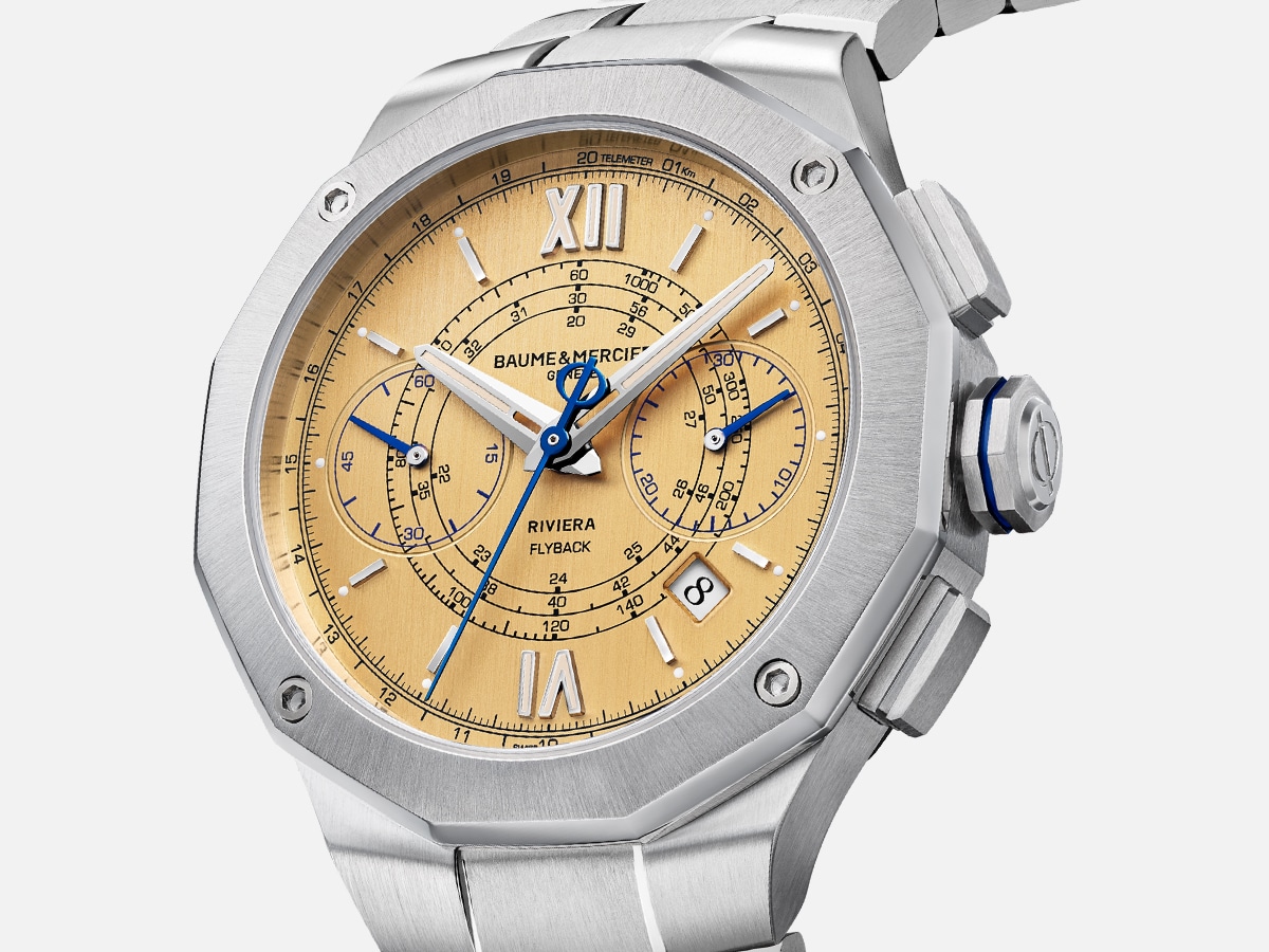 Baume & Mercier Riviera Chronograph, арт.M0A10826: Baume & Mercier открывает свой каталог «Часы и чудеса 2025» моделью Riviera Chronograph диаметром 41 мм.Это довольно интересная модель, в которой сочетаются современный спортивный хронограф и историческая эстетика.Мне нравится угловатый вид безеля, смещенного, но круглого.Это интересный контраст, который действительно добавляет часам ещё один архитектурный элемент.Часы доступны в чёрном или синем корпусе и выглядят классически привлекательно.