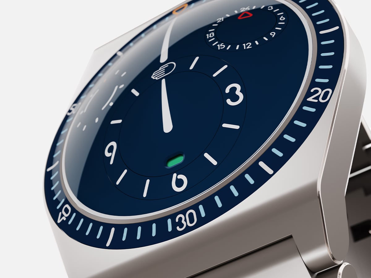 Безель: однонаправленный вращающийся безель из титана с матовой керамической вставкой и светящимся материалом