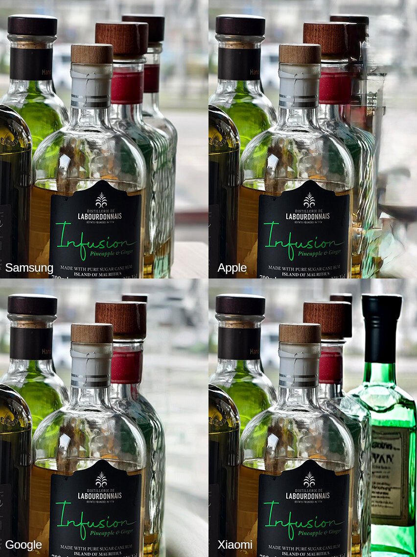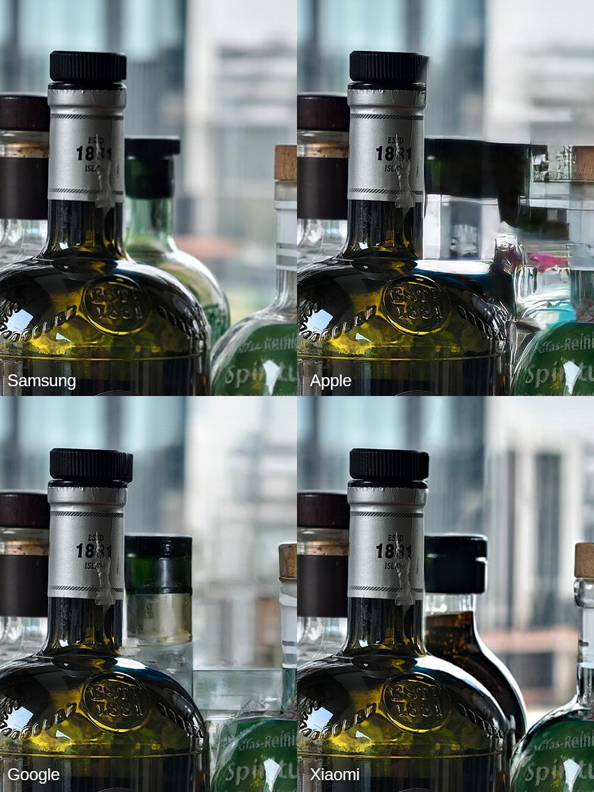 В первом тесте средство для мытья окон было помещено за другими бутылками, и в этом случае Galaxy AI и Xiaomi AI Erase показали одинаковый результат — оба представили бутылку на заднем плане. Размытие фона у Xiaomi на ступень хуже, чем у Samsung. Google лучше, чем Apple, но ни один из них не идеален.