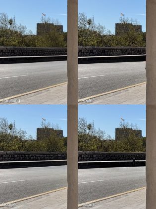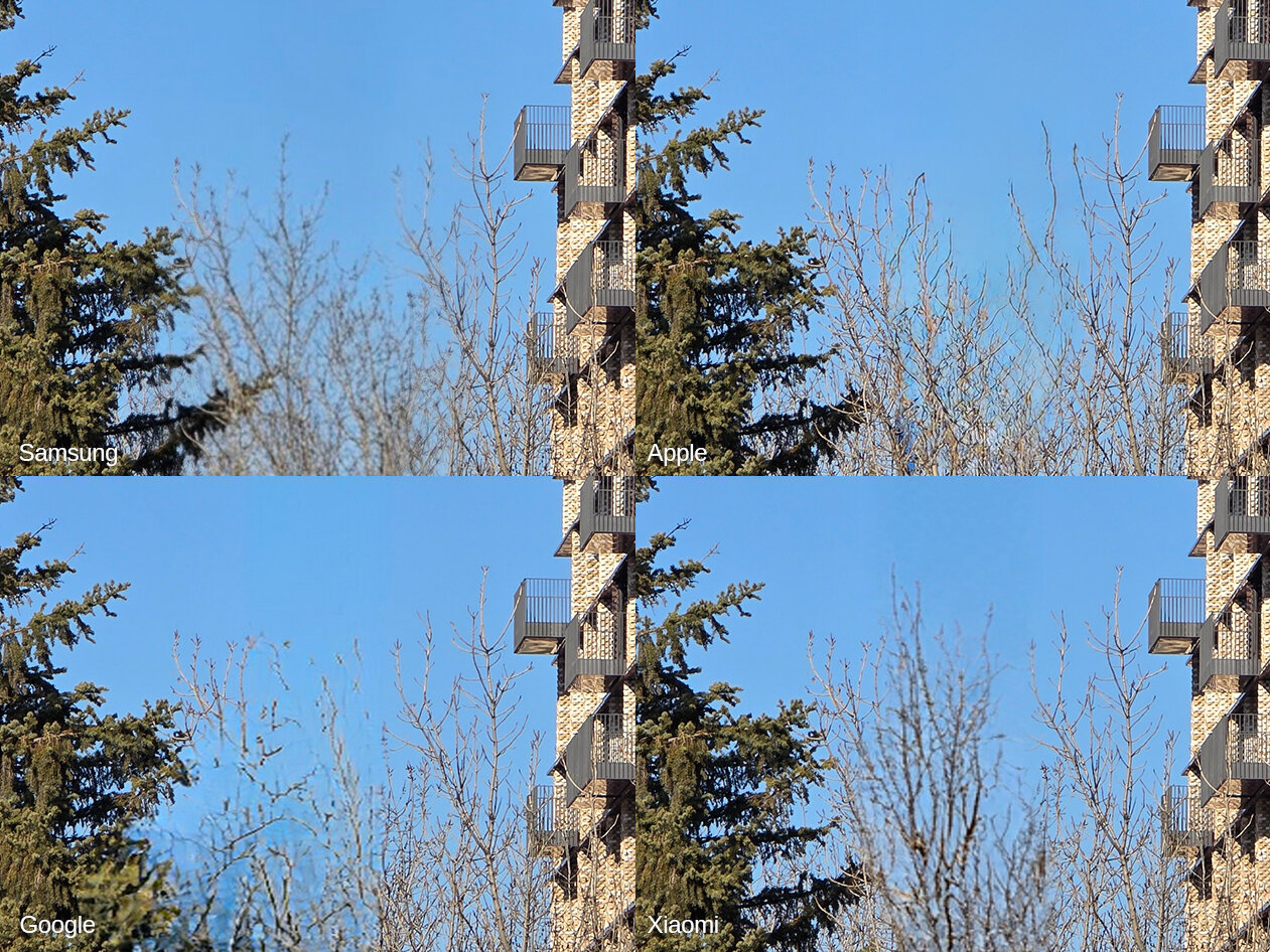 Это типичный пример снимка, сделанного туристом, — городской пейзаж, на котором что-то построено. Это также сложная задача для ИИ, и мы не можем сказать, что какое-либо из решений ИИ справилось с ней хорошо. Galaxy AI от Samsung лучше всего справился с изображением здания справа, но только Apple и Xiaomi сделали верхушку ели правдоподобной.