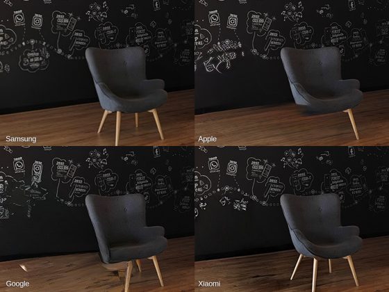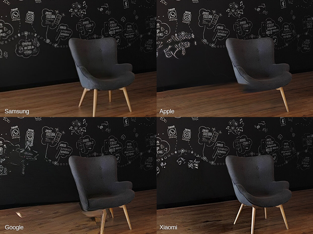 Это непростая задача — убрать стул на переднем плане, оставив второй стул и текст позади. Galaxy AI отлично справляется с этой задачей — вы бы не обратили внимания на фотографию Samsung (хотя водяной знак AI заметен). Xiaomi могла бы справиться не хуже, но оставила тёмное пятно на месте белого стула. Apple и Google не смогли справиться с этой сценой.